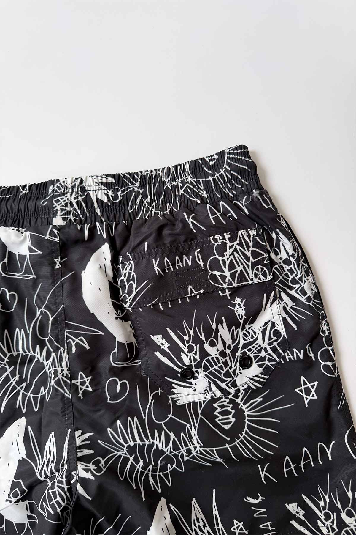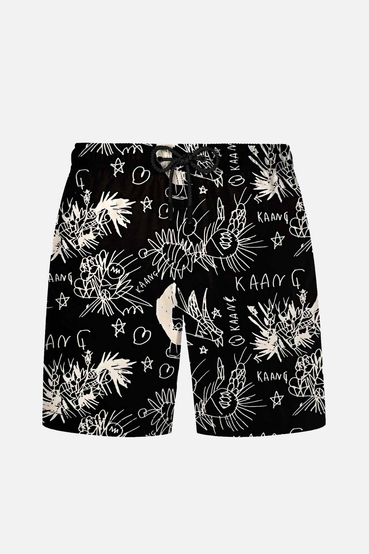 Siyah zemin üzerine beyaz tipografi, yıldız ve soyut çizimlerle bezeli bu deniz şortu, plaj stilinize sokak modasının enerjisini taşıyor. Konforu ön plana çıkaran belden lastikli ve ayarlanabilir bağcıklı yapısı sayesinde gün boyu mükemmel uyum sunar. Fonksiyonel tasarımı; yanlarda iki adet ve arkada bir adet güvenli cep ile tamamlanırken, %100 pamuk file astarı sayesinde cildinize nefes aldırır ve sudan çıktıktan sonra hızlı kuruma sağlar. Hem denizde hem de günlük sahil kombinlerinizde özgün bir duruş sergilemek isteyenler için tasarlandı.