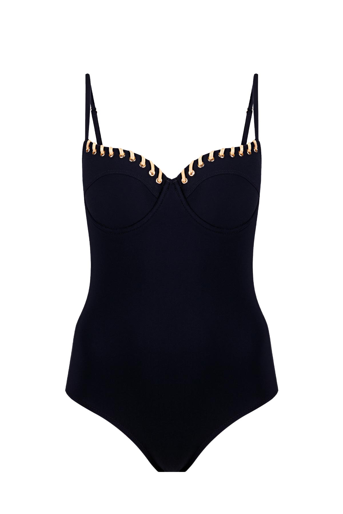 Tasarımın en dikkat çekici noktası, omuzlardan başlayıp göğüs dekoltesi boyunca zarif bir hat çizen gold renkli parlak biye detaylarıdır. Bu metalik dokunuşlar, siyahın mat dokusu üzerinde göz alıcı bir parıltı yaratırken, mayoya modern ve sofistike bir hava katıyor. Hem fit bir görünüm sağlayan toparlayıcı yapısı hem de gold detaylarıyla ön plana çıkan bu model, plajda kendinizi hem çok şık hem de son derece rahat hissetmeniz için tasarlandı.