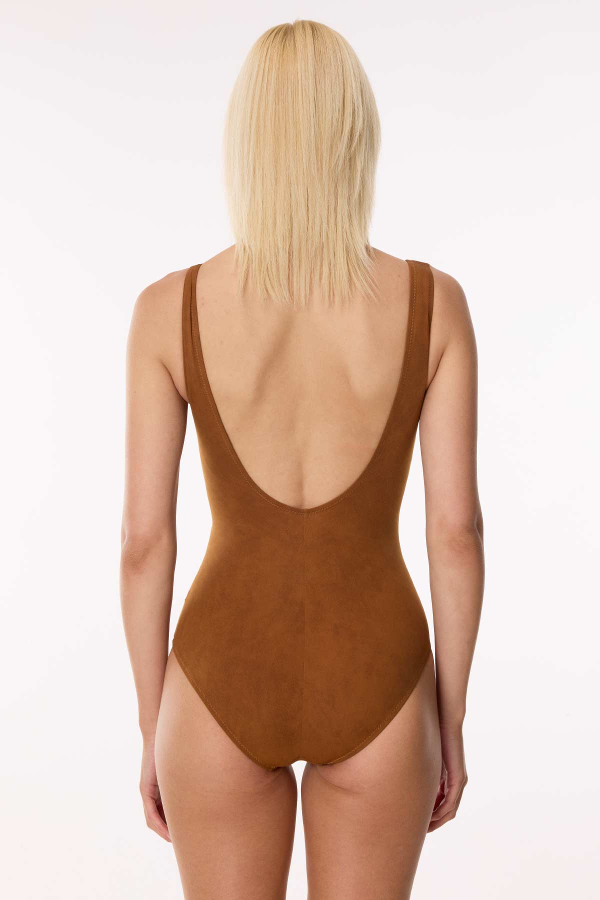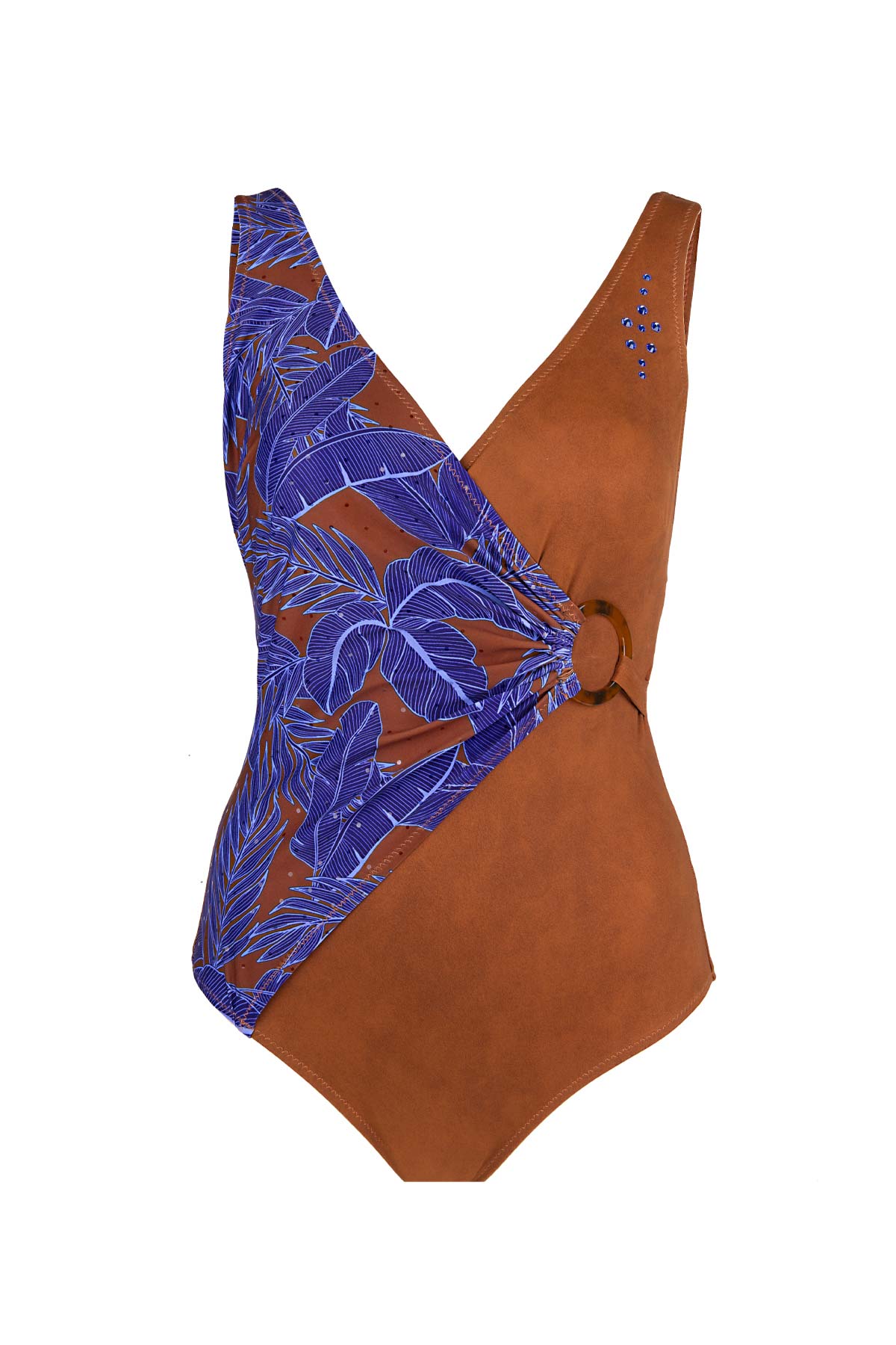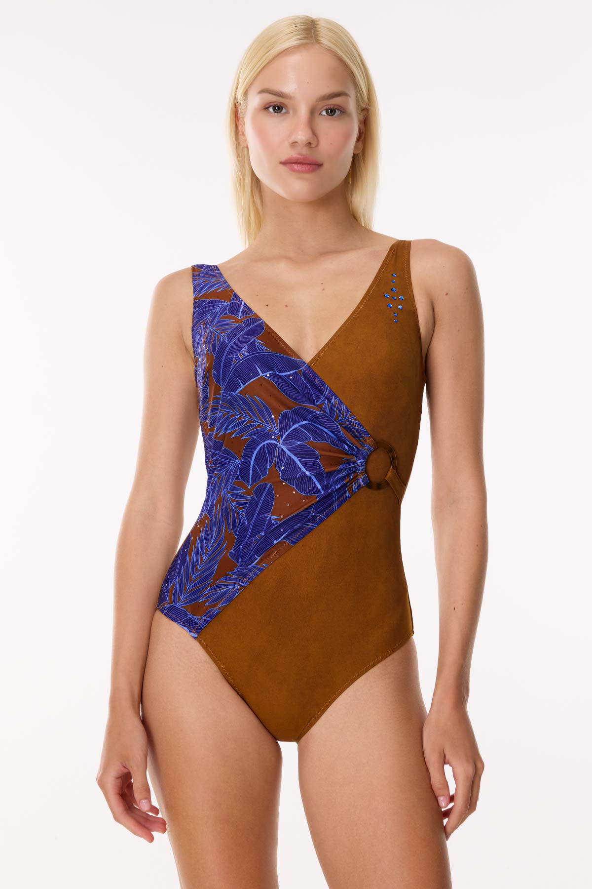 Taba renginin sıcak dokusunu mor palmiye desenlerinin egzotik enerjisiyle buluşturan bu mayo, plaj stilinde sofistike bir silüet arayanlar için tasarlandı. Kruvaze (zarf) kesimi sayesinde göğüs formunu zarifçe vurgularken, karın bölgesini destekleyen toparlayıcı yapısı daha fit ve güvenli bir duruş sergilemenize yardımcı olur. Bel hattında yer alan kemik rengi halka aksesuar, tasarıma modern bir odak noktası kazandırırken; omuz kısmındaki parlak mor taş işlemeleri lüks bir ışıltı sunar. Hem konforlu hem de iddialı bir plaj şıklığı için her detay titizlikle düşünüldü.