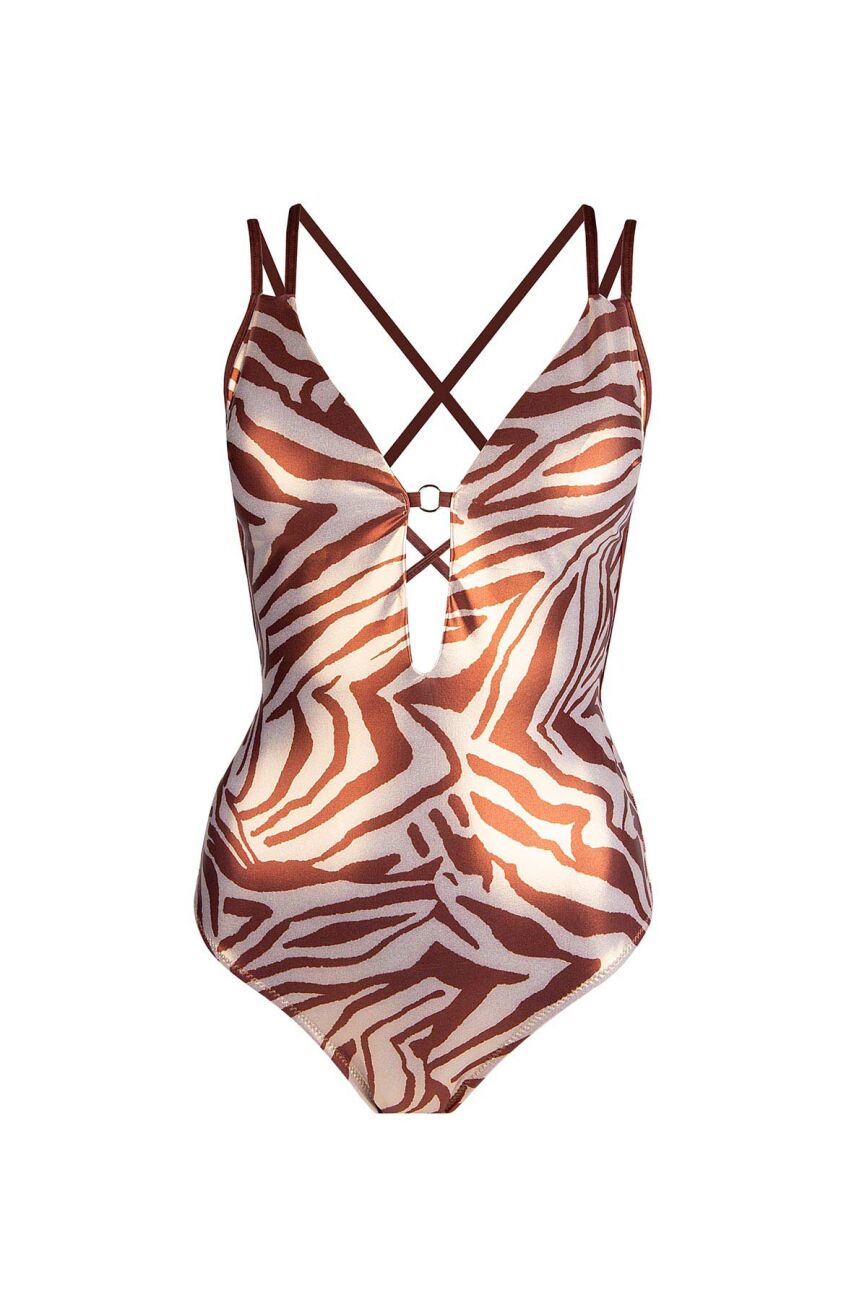 Vahşi zebra desenini bronz ışıltılı lame kumaşla yeniden yorumlayan bu mayo, plaj stilinde fark yaratmak isteyenler için tasarlandı. Göğüs dekoltesindeki derin V kesimi ve bu kesimi sabitleyen zarif altın halka detayı, tasarıma sofistike bir dokunuş katıyor. Sırt bölgesindeki çoklu çapraz askı detayları ve büzgü efektiyle her açıdan büyüleyici bir görünüm sunan bu model, parlak dokusuyla güneşin tüm ışıltısını üzerinizde topluyor. Hem cesur hem de estetik bir duruş sergilemek isteyenlerin bu yaz favorisi olmaya aday.