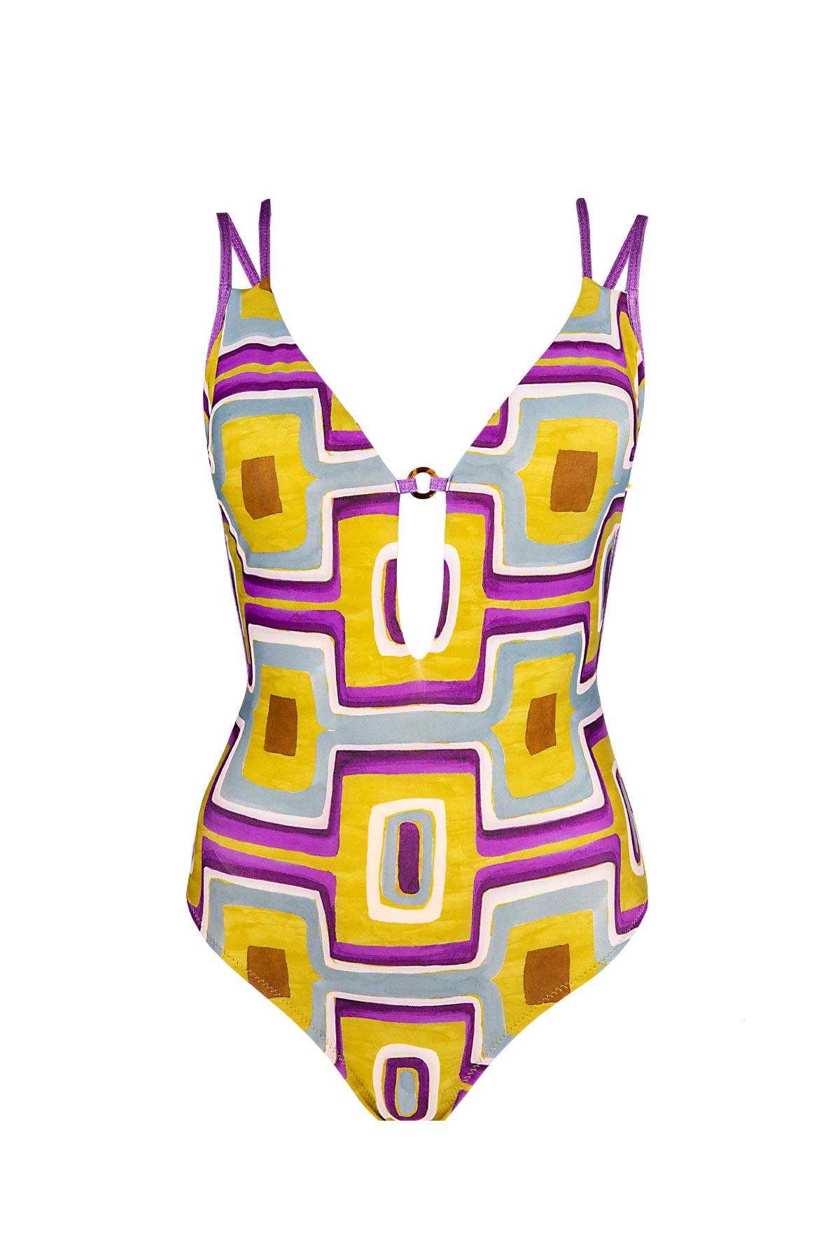 Mor, hardal ve bebek mavisi tonlarının hakim olduğu retro esintili geometrik desenleriyle bu mayo, plaj modasına dinamik ve sofistike bir dokunuş katıyor. Göğüs ortasında yer alan kemik kahve halka aksesuar, dekolte bölgesine modern bir odak noktası kazandırırken; sırtındaki çapraz bağlama (cross-back) detayı, her açıdan iddialı bir silüet oluşturuyor. Hem havuz başında hem de kumsalda kendinizi özgür ve göz alıcı hissetmeniz için tasarlandı. Renklerin canlı uyumu ve desenlerin ritmiyle yazın enerjisini stilinize taşıyın.