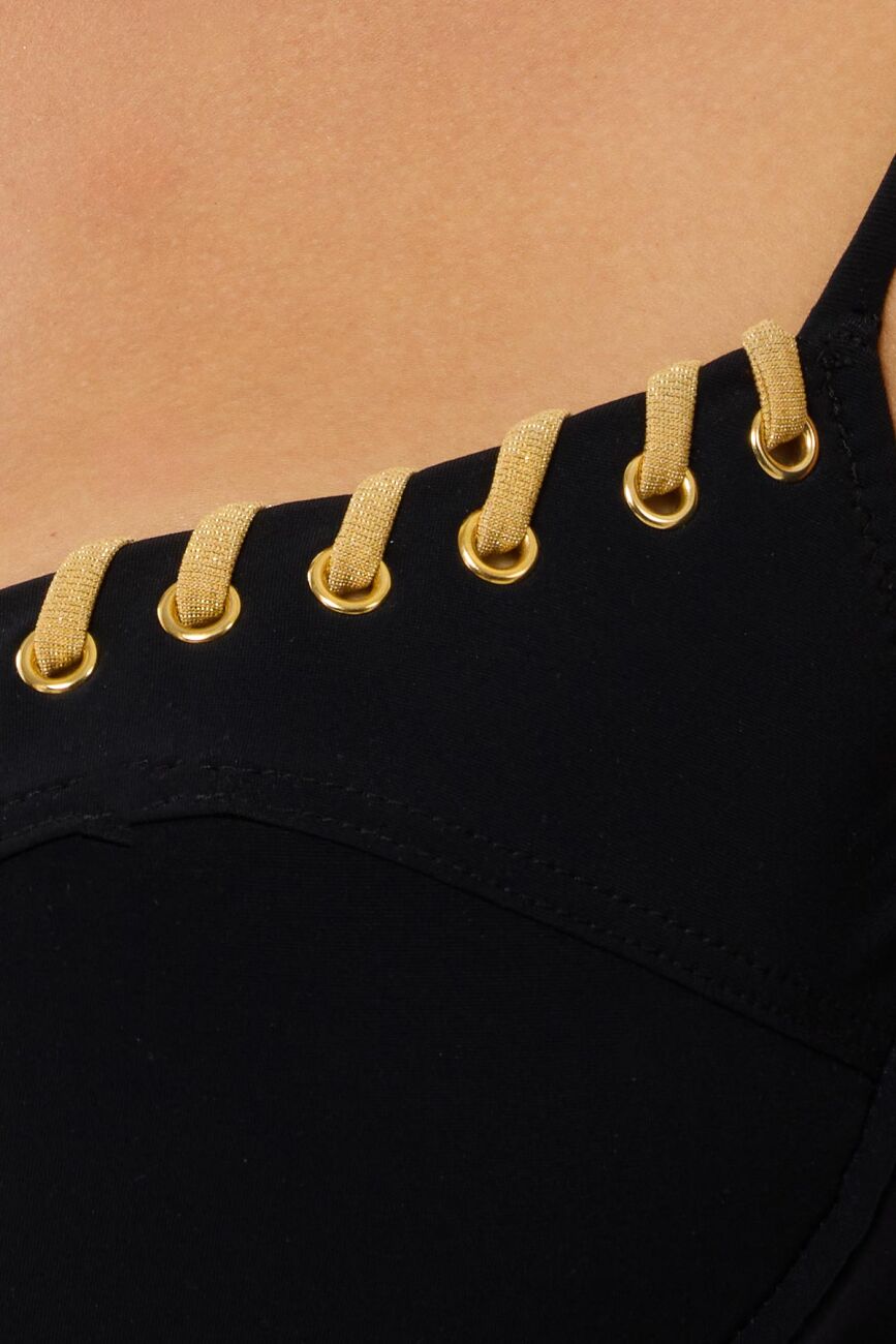 Plaj stilinde klasik şıklığı modern ve lüks detaylarla yeniden yorumlayın. Bu özel tasarım, pürüzsüz mayo kumaşının asil siyah tonunu, el işçiliği zarafetindeki gold biye detaylarıyla buluşturuyor. Bikini üstünün dekolte hattı boyunca sıralanan gold biyeler, bakışları üzerinize çeken rafine bir parıltı sunuyor.