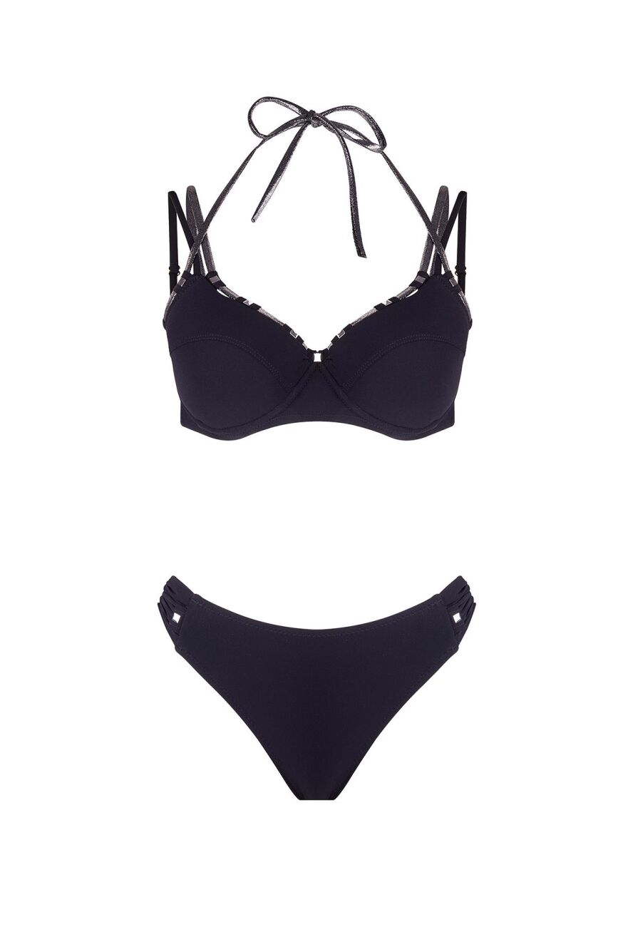 Alt parçanın yanlarında kullanılan büzgü detayları, silüetinize yumuşak bir dokunuş katarken; buradaki gümüş zımba dokunuşları üst parça ile kusursuz bir metalik bütünlük sağlar. İnce askılı ve balenli üst form, ideal desteği sunarak plajdan gün batımı davetlerine kadar size eşlik etmek için tasarlandı. Hem siyahın vazgeçilmez asaletini hem de gümüş metalik detayların premium etkisini bir arada sunan bu parça, bu yazın en iddialı ve soğuk şıklığa sahip silüetlerinden biri olacak.