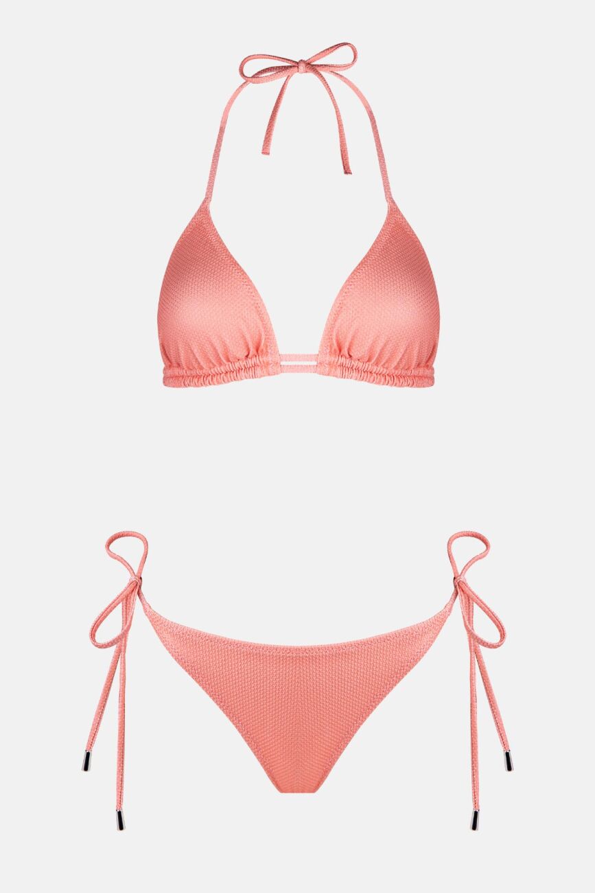 Yazın sıcaklığını ve romantizmini teninize taşıyan bu mercan rengi bikini takımı, sahil modasında sıcak ve enerjik bir stil beyanı sunuyor. Markamızın imzasını taşıyan bu özel tasarım, kumaşındaki hafif pütürlü dokusu sayesinde derinlik ve premium bir his kazanırken, içine ustalıkla gizlenmiş nazik sim geçişleri güneş ışığıyla her buluştuğunda büyüleyici bir ışıltı saçıyor. Zamansız üçgen kesim üst parçası ve ayarlanabilir yan bağcıklarıyla vücut hatlarınıza kusursuz bir uyum sağlayan model, bağcık uçlarındaki gümüş metalik detaylarla mücevher zarafetini tamamlıyor. Hem teknik kumaşın sunduğu premium form hem de mercanın huzur veren ve canlı tonuyla bu bikini, sahil şeridinde taze, enerjik ve bir o kadar da iddialı bir silüet yaratmak isteyenler için bu yazın vazgeçilmez parçası olacak.