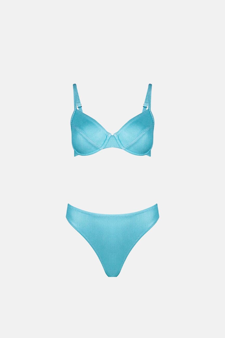 Denizin derinliğini ve gökyüzünün ferahlığını yansıtan okyanus mavisi tonuyla tasarlanan bu bikini takımı, plaj stilinizde sofistike bir duruş sergilemenizi sağlıyor. Dünya çapında bir klasik olan balkonet kesim üst parçası, göğsü doğal bir şekilde toparlayarak dik ve estetik bir form kazandırırken, kapsız yapısı sayesinde gün boyu süren bir konfor vadediyor. Kumaşın kendi özel hafif dokulu yapısı, tasarıma derinlik katıyor ve klasik düz kumaşlardan ayrılan modern bir dokunuş sunuyor.