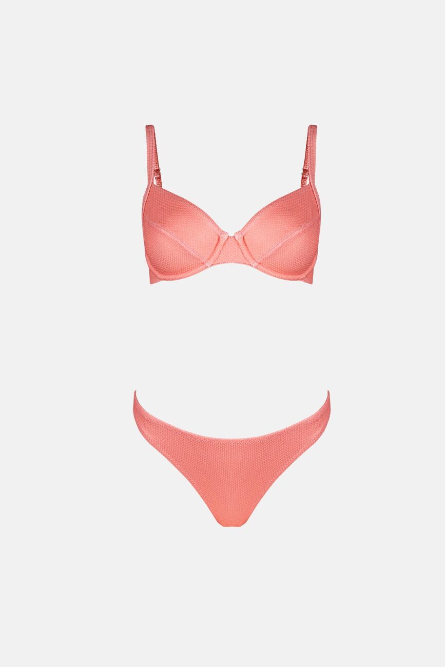 Güneş ışığını her hareketinizde yakalayan zarif sim detayları, somon renginin sıcaklığıyla birleşerek plajda sofistike bir ışıltı saçmanızı sağlıyor. Hem şıklığı hem de konforu bir arada sunan bu takım, alt parçasındaki yüksek kesim (high-leg) detayı ve yanlardaki ayarlanabilir bağlama ipleriyle vücut hatlarınızı zarifçe vurguluyor ve bacak boyunu uzun gösteren estetik bir siluet oluşturuyor. Tatil gardırobunuzun en şık ve konforlu parçalarından biri olmaya aday olan bu takım, doğal güzelliğinizi ışıltılı bir dokunuşla ön plana çıkarıyor.