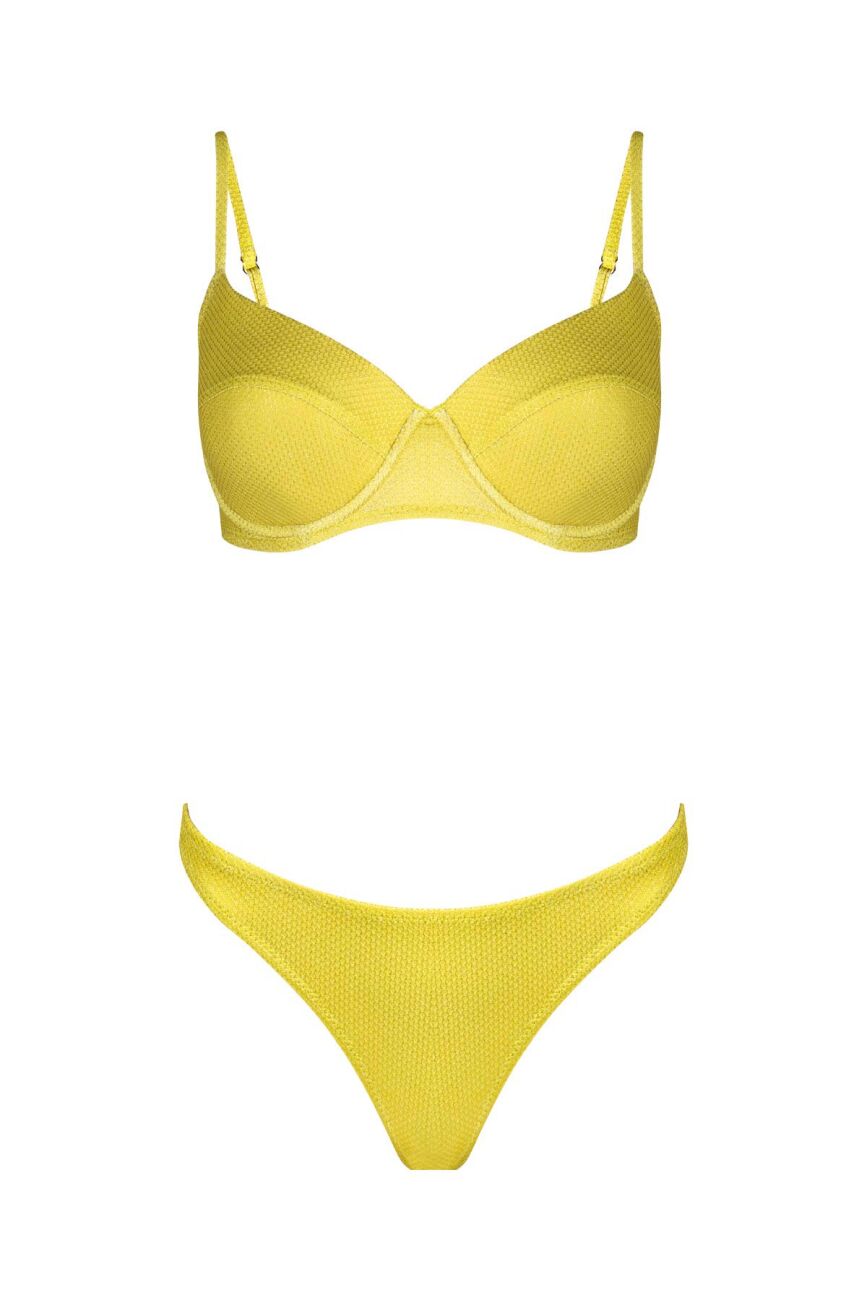 Ürünün kumaşında yer alan hafif pütürlü doku, tasarıma modern bir derinlik katarken, kumaşa ince bir ustalıkla işlenen zarif sim detayları güneş ışığı altında büyüleyici bir parıltı saçar. Bu modelde tercih edilen bağcıksız bikini altı, sade ve net hatlarıyla vücut formunu pürüzsüz bir şekilde sararak bütünsel bir zarafet sunar. Hem konforu hem de göz alıcı detayları ön plana çıkaran bu takım, doğal güzelliğinizi enerjik bir ışıltıyla tamamlamak için ideal bir tercihtir.
