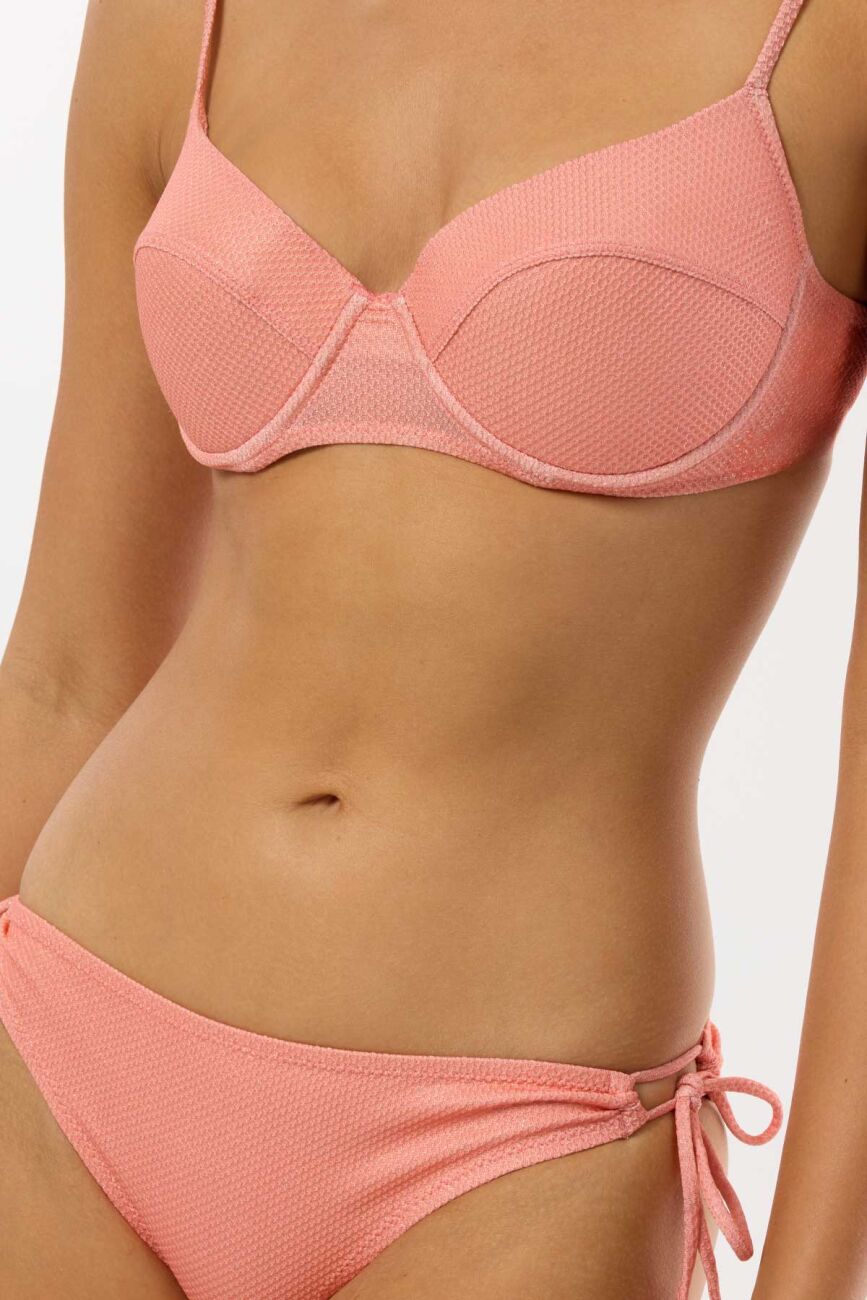 Güneşin her yansımasında kendini gösteren zarif sim detayları, somon tonunun enerjisiyle birleşerek cildinizde büyüleyici bir parıltı yaratır. Alt parçanın yanlardan ayarlanabilir bağcıklı yapısı, bikiniyi kendi vücut formunuza göre mükemmel şekilde kişiselleştirmenize olanak tanırken, hareketli ve dinamik bir stil sunar. Hem şık hem de işlevsel bir tercih olan bu takım, ince detayları ve formunu koruyan yapısıyla tatil boyunca vazgeçilmez parçanız olacak.