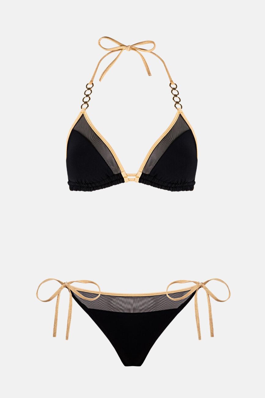 Omuz hattında birer mücevher gibi parlayan altın rengi halka zincir aksesuarlar, tasarıma heykelsi bir form kazandırırken lüks bir duruş sergiliyor. Boyundan bağlamalı üçgen kesim üst parça ve yanları ayarlanabilir ince bağcıklı alt parça, vücudunuza mükemmel uyumu garanti eder. Hem dokuların bu zarif oyunu hem de gold detayların premium hissiyle, bu yazın en çok konuşulan silüetine sahip olacaksınız.