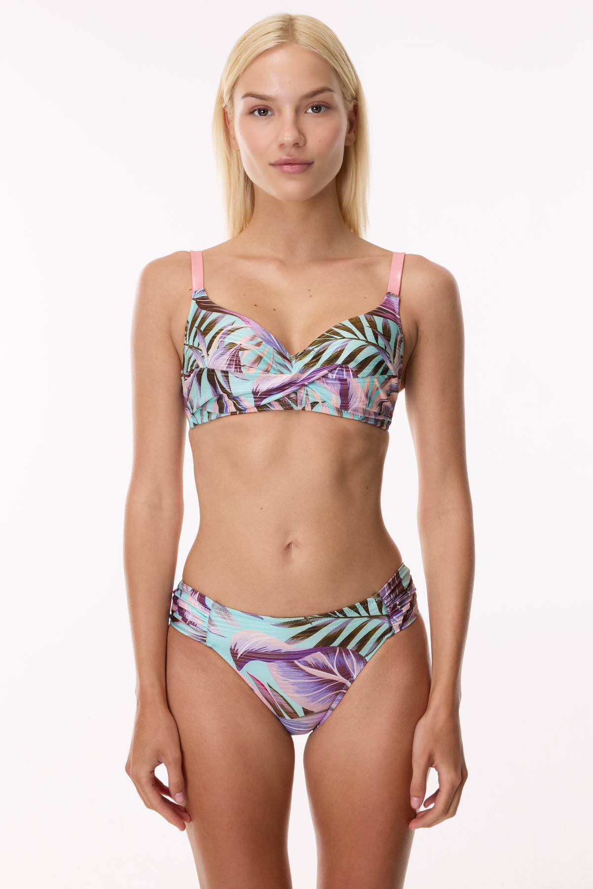 Plaj stilinizde hem iddialı bir enerji hem de maksimum güven arayanlar için tasarlandı. Bu özel model, egzotik yaprak desenlerini parlak lame kumaşın büyüleyici metalik yansımalarıyla birleştirerek güneşin altında göz alıcı bir silüet yaratıyor. Pastel mor, turkuaz ve pembe tonlarının eşsiz geçişi, lame dokunun sunduğu lüks hisle birleşerek sahil şeridinde modern bir tropikal esinti estiriyor.