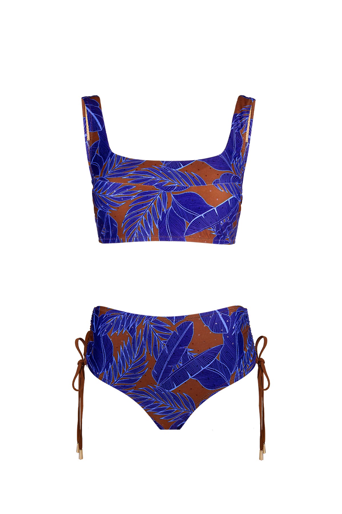 Sıcak toprak tonları üzerine işlenen canlı mor yaprak desenleriyle bu bikini takımı, plaj stilinize hem dinamik hem de toparlayıcı bir dokunuş katıyor. Yarım atlet formuyla göğüs bölgesini güvenle saran üst parça, omuzlardaki geniş askılarıyla gün boyu maksimum konfor sunar. Yüksek bel alt parçası, yanlardaki büzgü detayları ve zarif fiyonk bağlamalarıyla vücut hatlarını mükemmel şekilde dengelerken; fiyonk uçlarındaki gold renkli aksesuar detayları tasarıma lüks bir bitiş kazandırıyor. Hem spor hem de sofistike bir duruş arayanlar için tasarlandı.