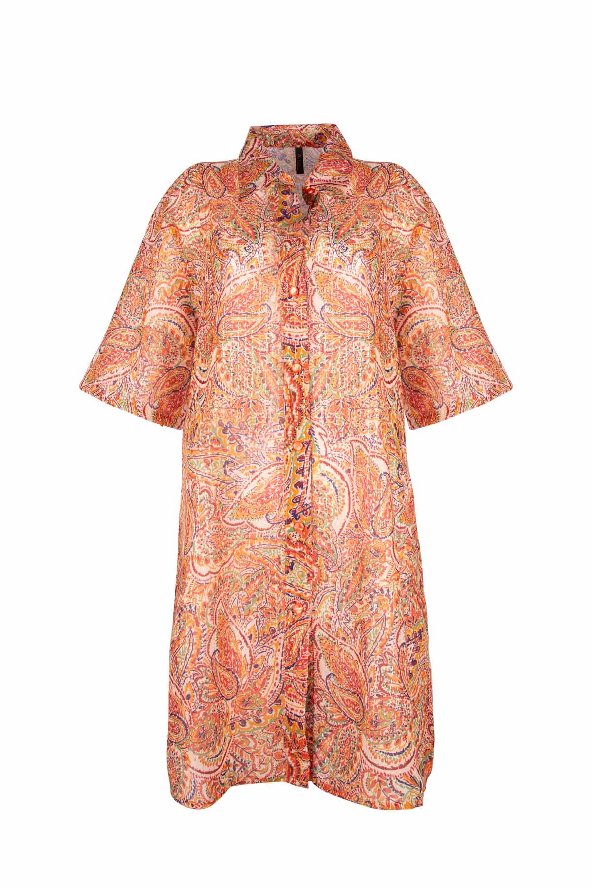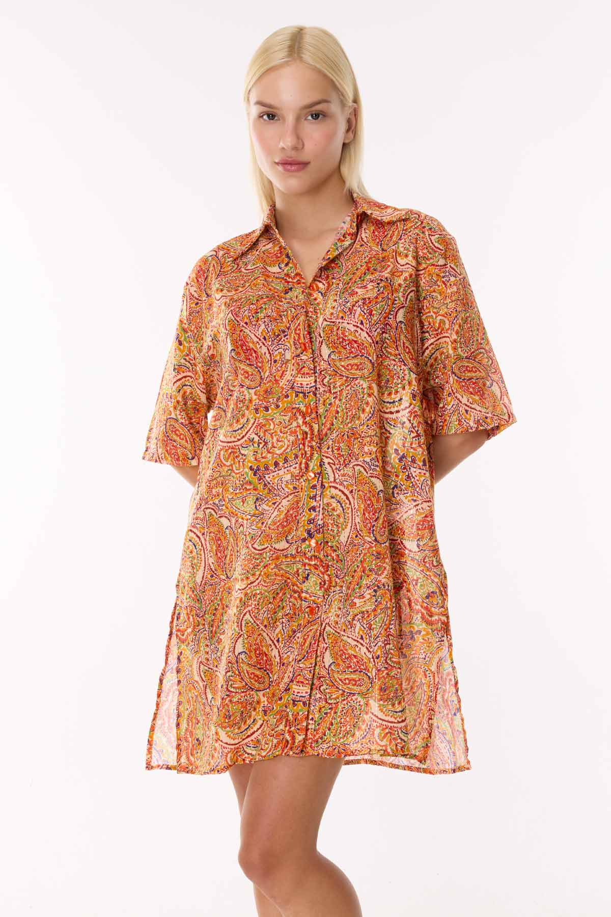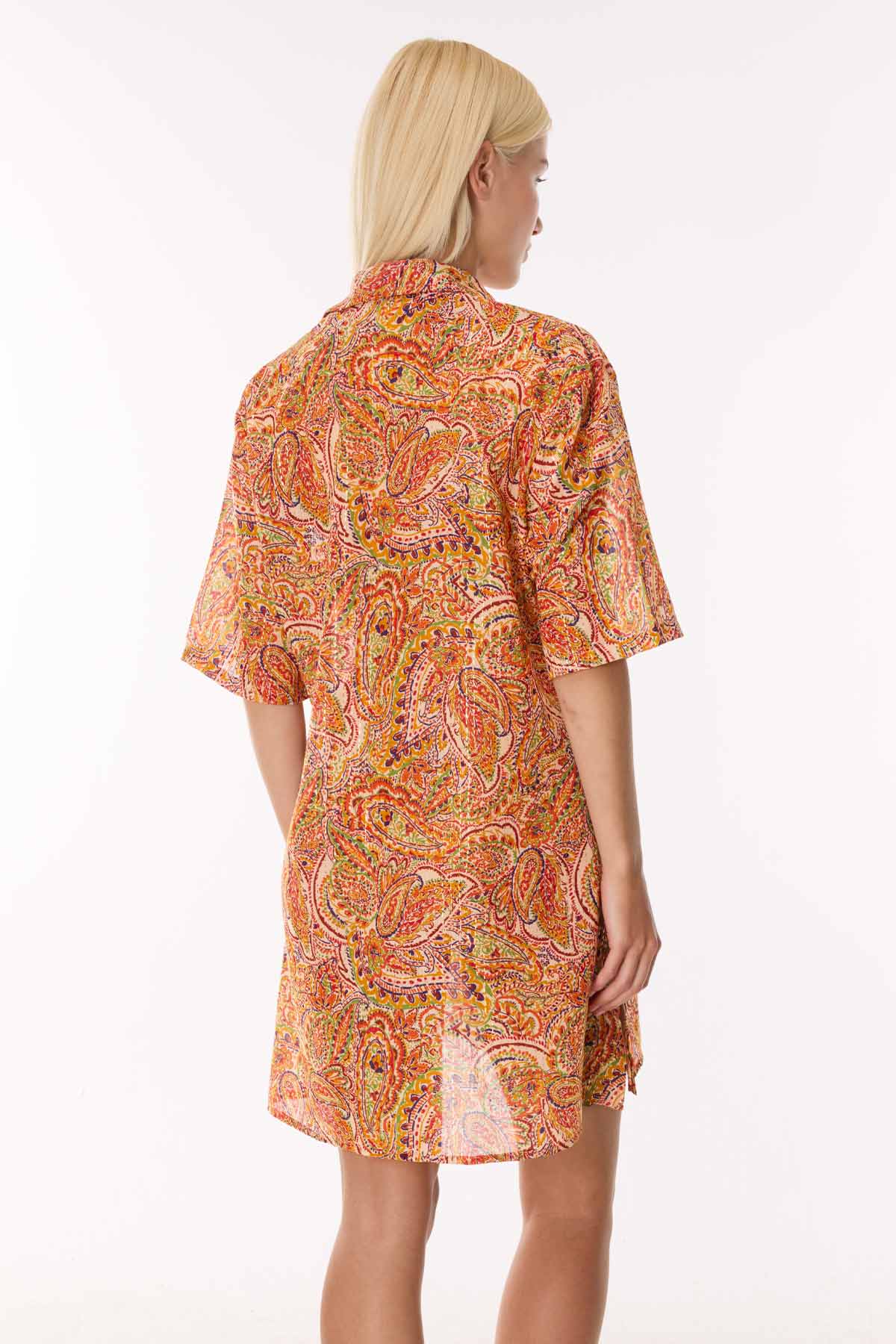 Yazın enerjisini yansıtan canlı mercan ve turuncu tonlarındaki bohem şal (paisley) deseniyle bu elbise, plaj stilinize sofistike bir dokunuş katıyor. Klasik ve zamansız gömlek yaka (kent yaka) tasarımıyla öne çıkan bu model, önü komple düğmeli yapısı sayesinde hem elbise hem de kimono olarak çok yönlü bir kullanım sunar. Kısa kollu dökümlü kesimi ve her iki yanındaki kısa yırtmaç detayları, hareket özgürlüğü sağlarken tasarıma modern bir hava katar. Hafif ve nefes alan kumaşıyla plajdan şehir hayatına zahmetsiz bir geçiş yapmanızı sağlar. Bu desenin büyüleyici mayo ve bikini modelleriyle plaj kombinini mutlaka tamamlayın.