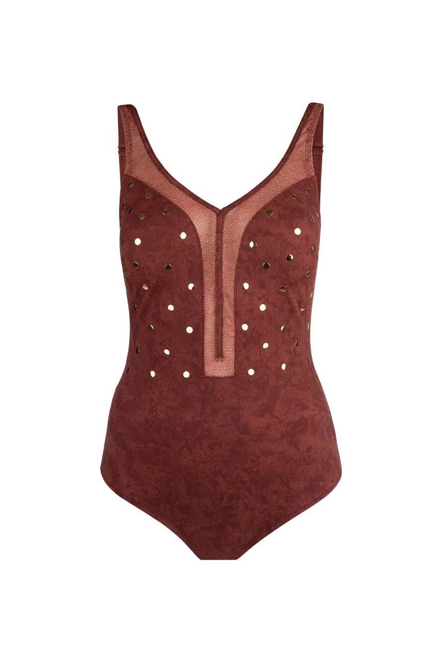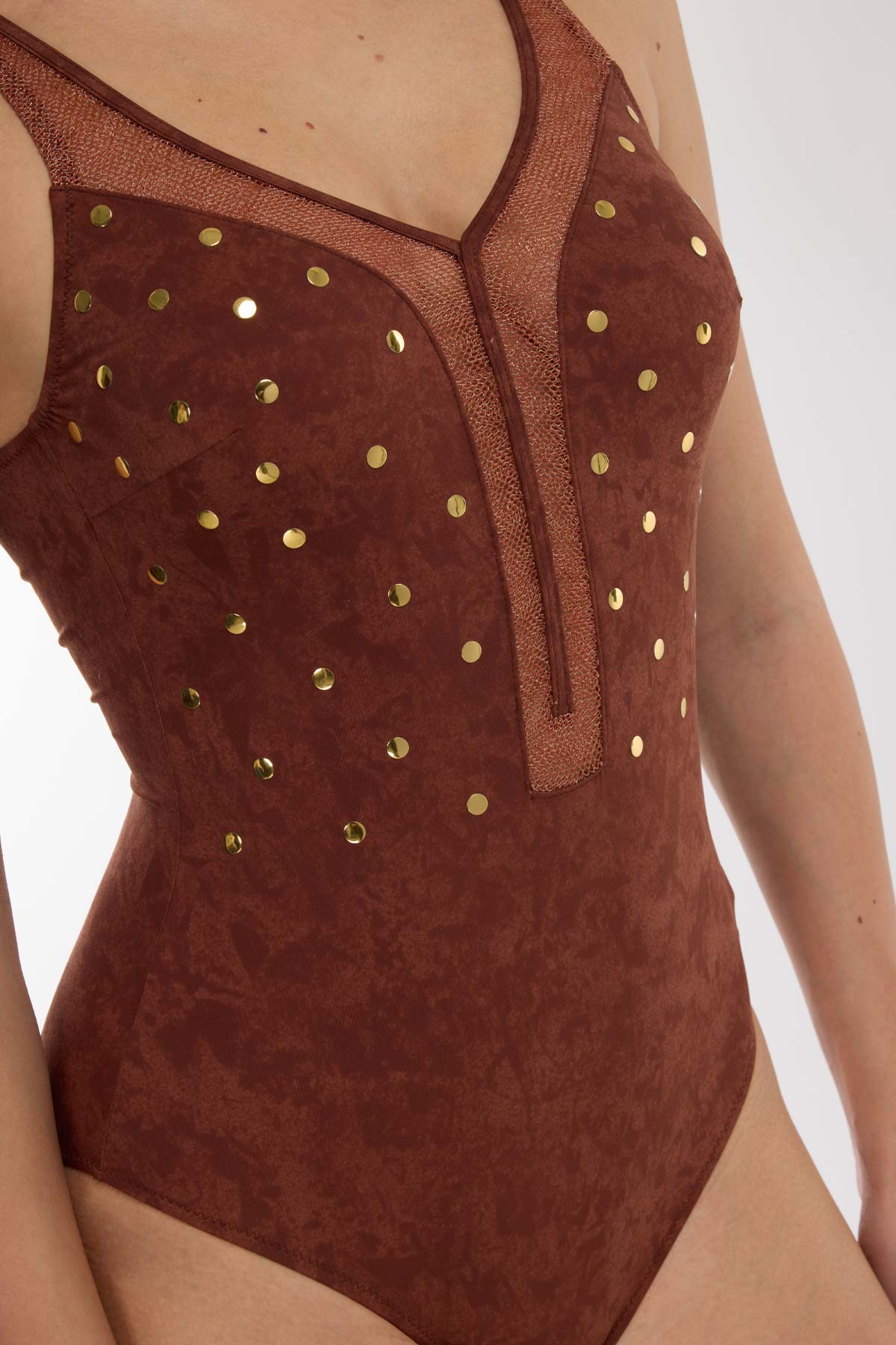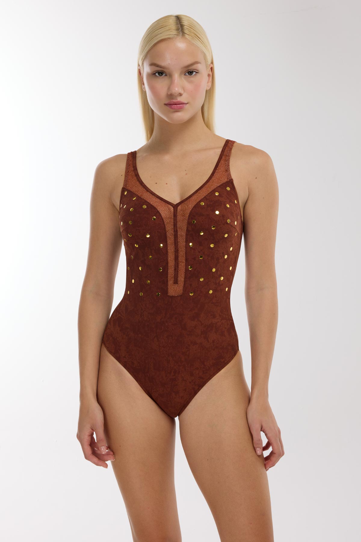 Tasarımın en zarif noktası, omuzlardan göğüs ortasına kadar uzanan yumuşak şifon tül detayıdır. Bu transparan dokunuş, bakır tonunun sıcaklığıyla birleşerek mayoya modern ve romantik bir hava katıyor. Gövde kısmına titizlikle yerleştirilen gold rengi zımba işlemeleri, güneş ışığı altında parıldayarak tasarıma zengin bir ışıltı kazandırıyor. Hem fit bir görünüm sağlayan toparlayıcı yapısı hem de şifon ve gold detaylarıyla ön plana çıkan bu model, plajda kendinizi hem güvende hem de son derece şık hissetmeniz için tasarlandı.