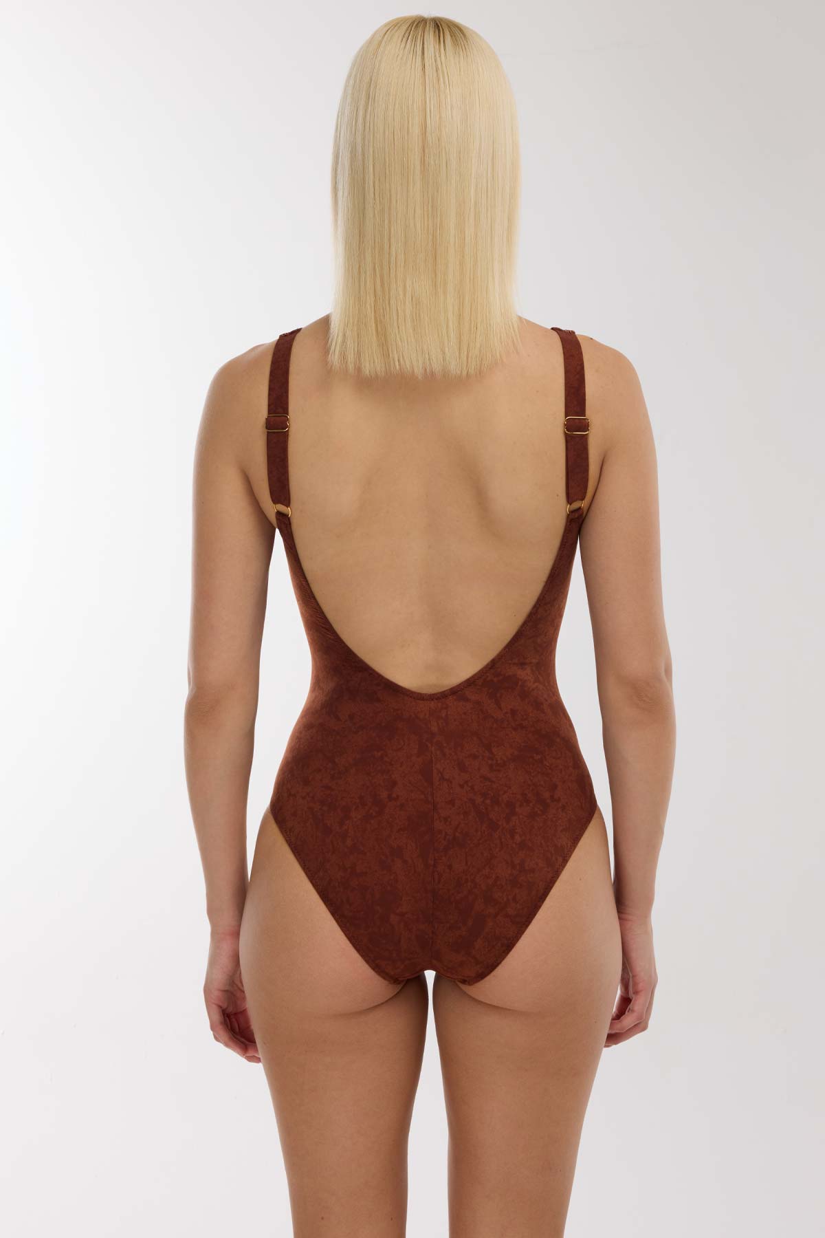 Plajda hem kusursuz bir silüet hem de sofistike detaylar arayanlar için tasarlanan bu bakır tonundaki mayo, fonksiyonelliği lüks bir estetikle birleştiriyor. Mayo kumaşının özel dokusu, vücut hatlarını nazikçe sararak toparlayıcı bir etki yaratırken, esnek yapısı sayesinde gün boyu yüksek konfor sunan bir kullanım deneyimi vadeder.