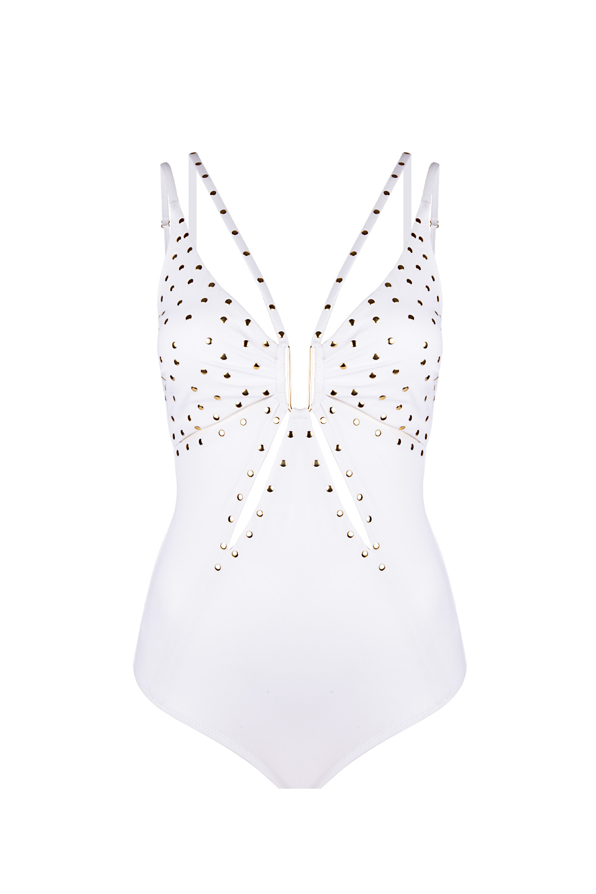 Kar beyazı kumaş üzerine titizlikle işlenen altın renkli zımba detaylarıyla bu mayo, plaj modasında asil ve çarpıcı bir duruş sergiliyor. Göğüs ortasında yer alan U formundaki gold aksesuar tasarıma modern bir derinlik katarken, gövde üzerindeki stratejik pencere dekolteleri (cut-out) geometrik bir estetik sunuyor. Omuzlardan arkaya doğru uzanan çoklu ince askı tasarımı ve gold detayların yarattığı ışıltılı kontrast, plaj şıklığınızı en üst seviyeye taşıyor. Hem sofistike bir silüet hem de lüks bir detay anlayışı arayanlar için kusursuz bir seçim.