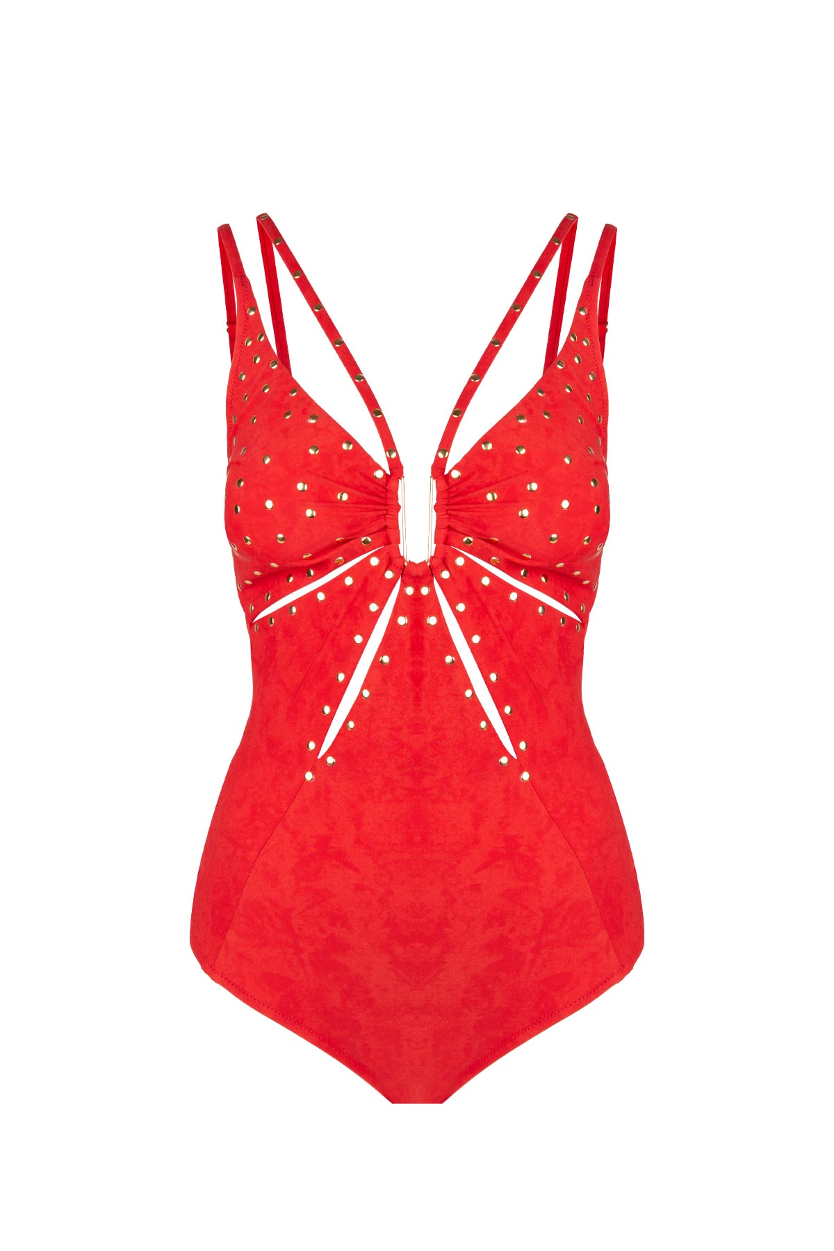 Canlı koral tonuyla yazın enerjisini stilinize taşıyan bu mayo, süet görünümlü lüks kumaşıyla plaj modasında fark yaratıyor. Tasarımın en dikkat çekici yanı, göğüs dekoltesinden gövdeye doğru sanatsal bir formda yayılan altın rengi zımba işlemeleridir. Bu metalik detaylar, koral renginin sıcaklığıyla birleşerek güneş ışığı altında göz alıcı bir parıltı sunarken, göğüs ortasındaki altın rengi U formu aksesuar dekolteye modern ve iddialı bir derinlik kazandırıyor.