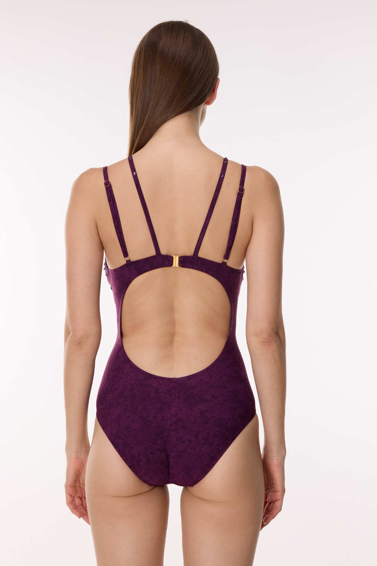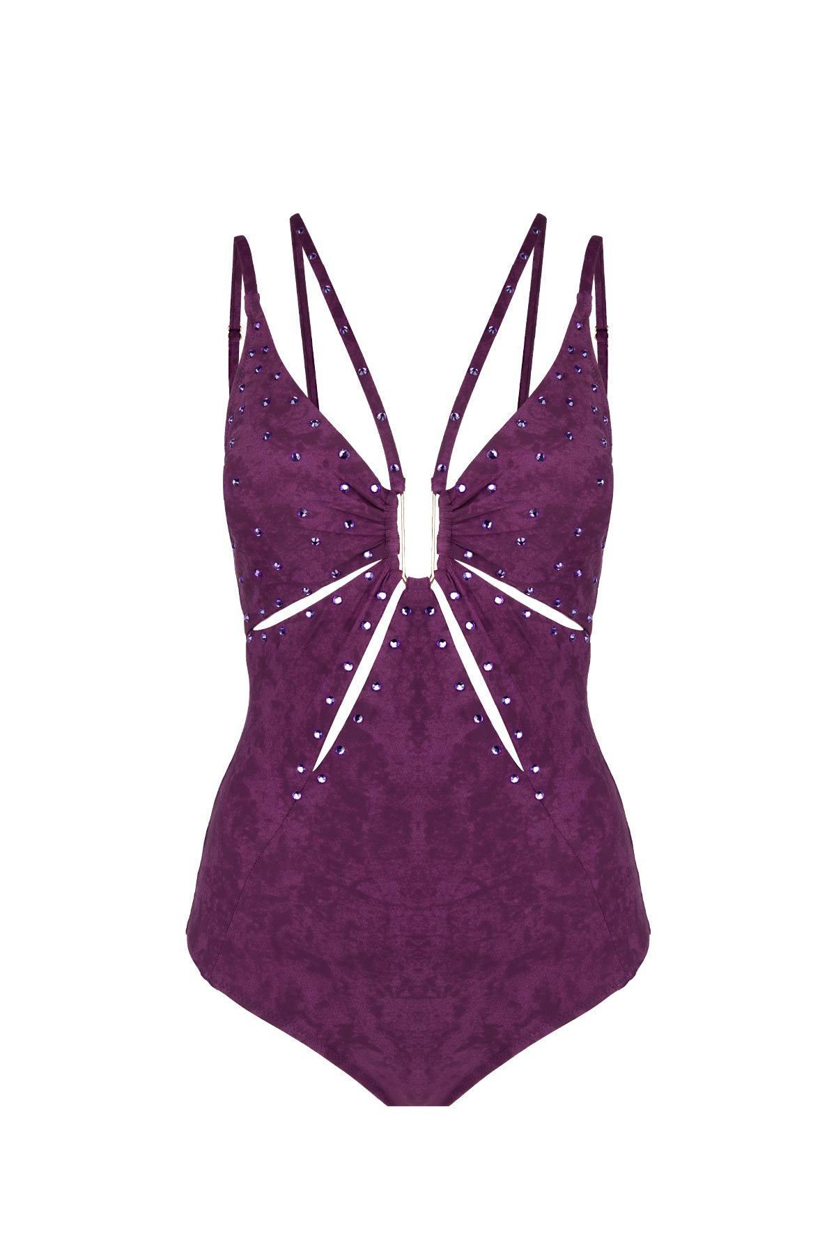 Derin mor tonunun büyüleyici asaletini süet görünümlü mayo kumaşının lüks dokusuyla birleştiren bu mayo, plaj stilinize sofistike bir imza atıyor. Tasarımın en çarpıcı özelliği, göğüs dekoltesinden başlayarak gövdeye doğru sanatsal bir formda yayılan mor renkli taş işlemeleridir. Bu aynı tondaki ışıltılı detaylar, süet kumaşın mat dokusu üzerinde zarif bir derinlik yaratırken, göğüs ortasındaki altın rengi U formu aksesuar dekolteye modern ve iddialı bir vurgu kazandırıyor.