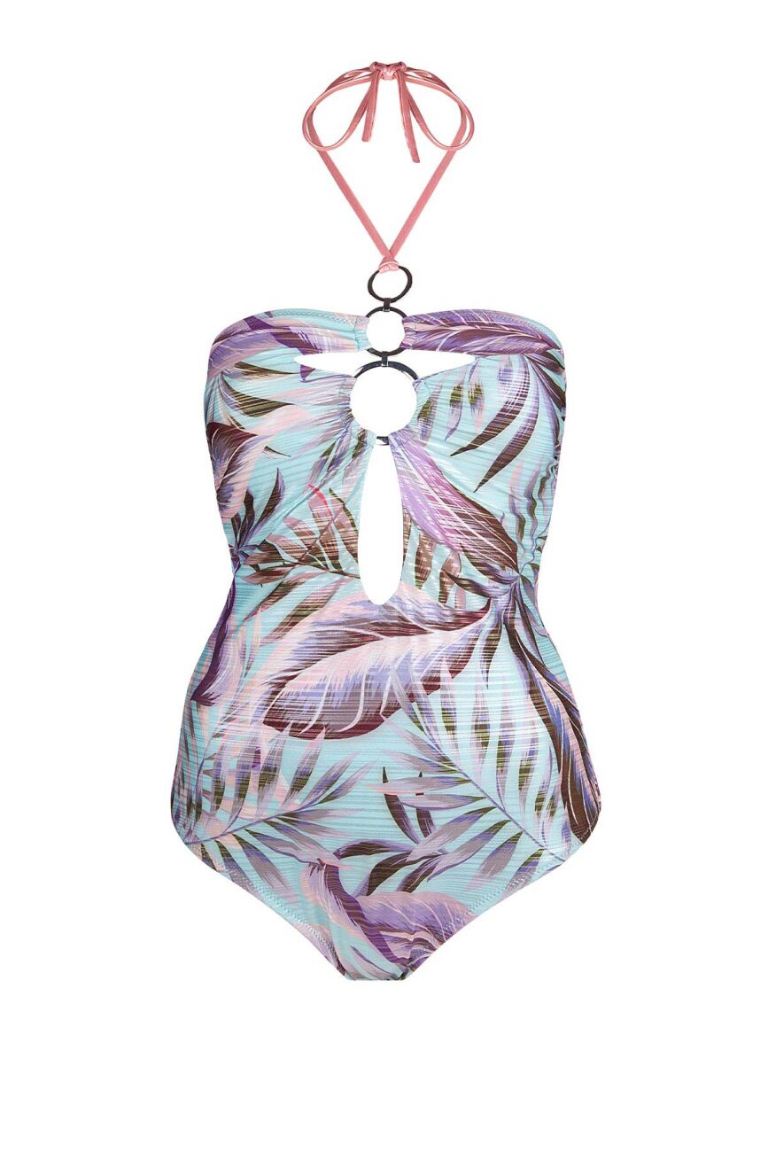 Turkuazın ferahlığını mor ve pembe palmiye yapraklarıyla buluşturan bu mayo, parlak lame kumaşı sayesinde her adımda güneşin ışıltısını stilinize yansıtıyor. Göğüs dekoltesindeki iç içe geçmiş gümüş rengi halka aksesuarlar ve modern pencere detayı, tasarıma sofistike bir hareket katıyor. Boyundan bağlamalı pembe ince askısı ve vücut hatlarını zarifçe ortaya çıkaran kesimiyle plajda hem enerjik hem de lüks bir duruş sergilemek isteyenler için tasarlandı.