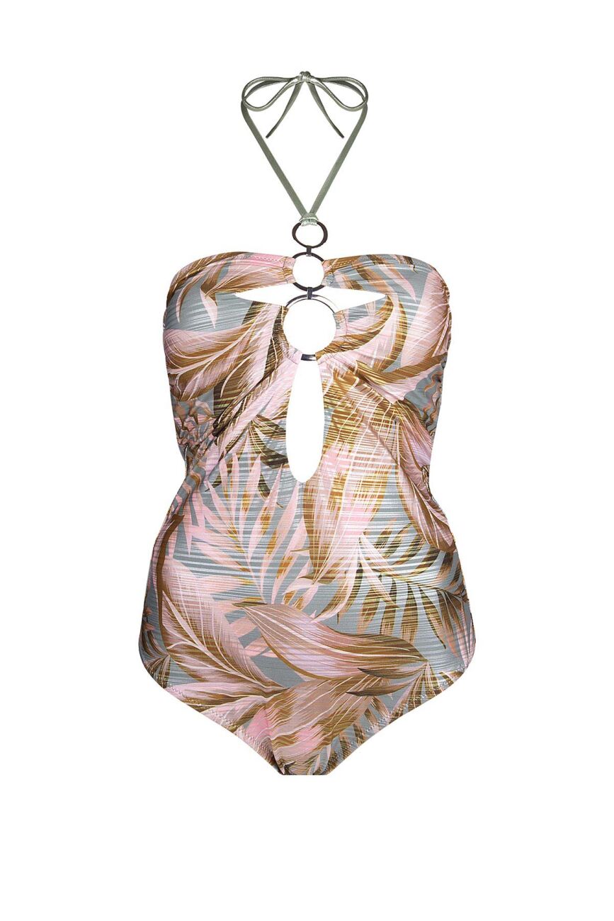 Ada çayı yeşili zemin üzerine tropikal palmiye desenlerini metalik bir parıltıyla taşıyan bu mayo, modern kesimiyle plaj şıklığını yeniden tanımlıyor. Göğüs dekoltesinde yer alan iç içe geçmiş gümüş renkli halka aksesuarlar ve bu detayı tamamlayan pencere dekoltesi, tasarıma sofistike bir derinlik katıyor. Boyundan bağlamalı ince askısı ve vücudu kusursuzca saran lame kumaşıyla hem güvenli bir kullanım hem de estetik bir silüet sunan bu model, ışıltısıyla tüm bakışları üzerinde toplamak isteyenler için tasarlandı.