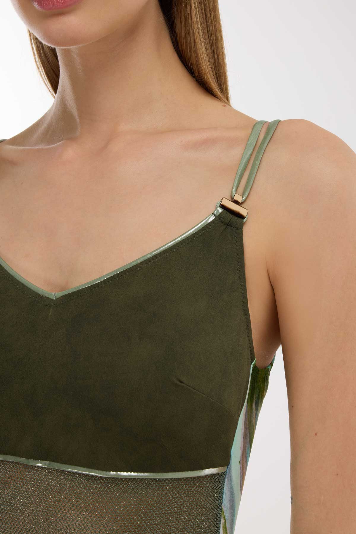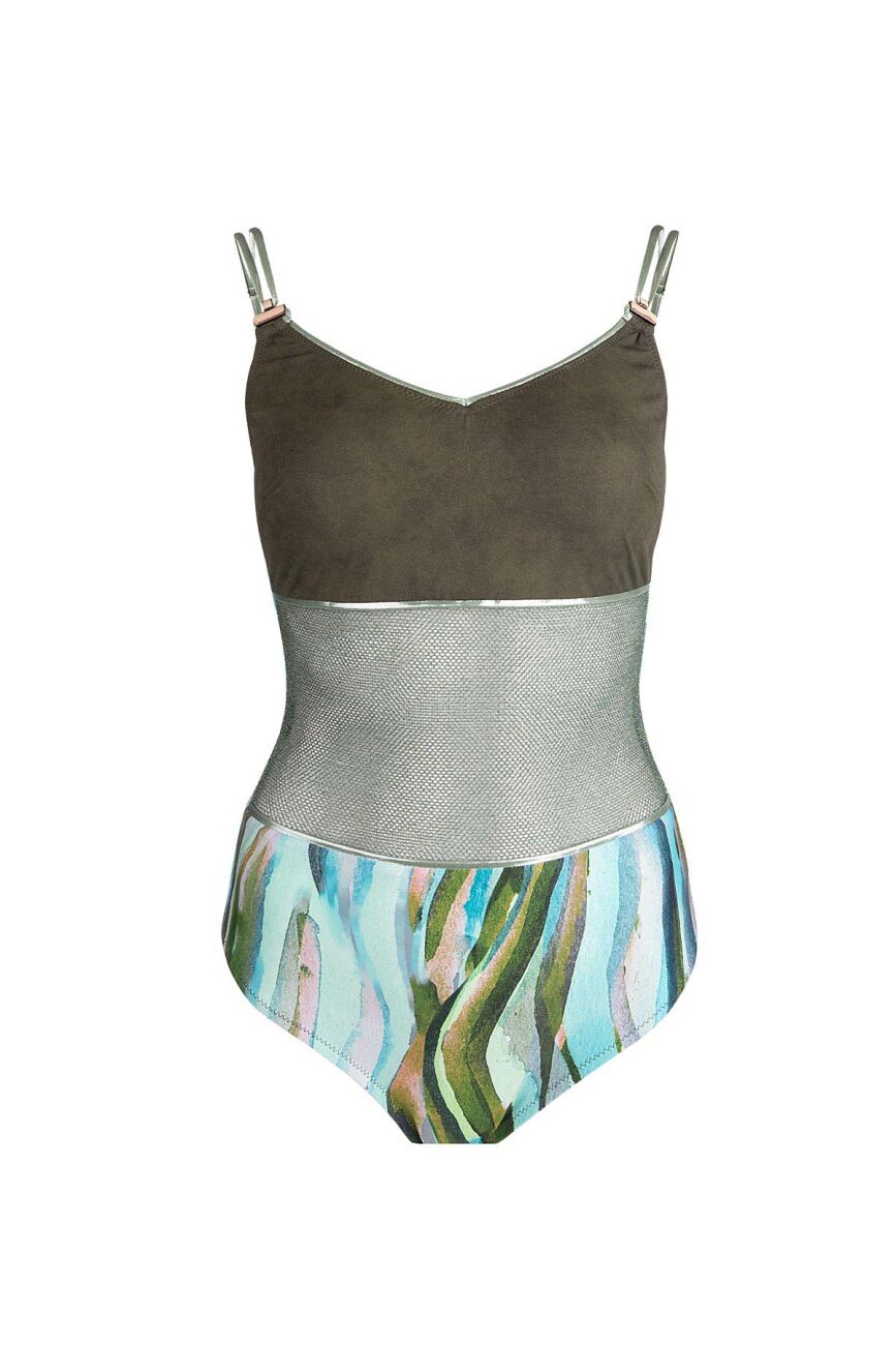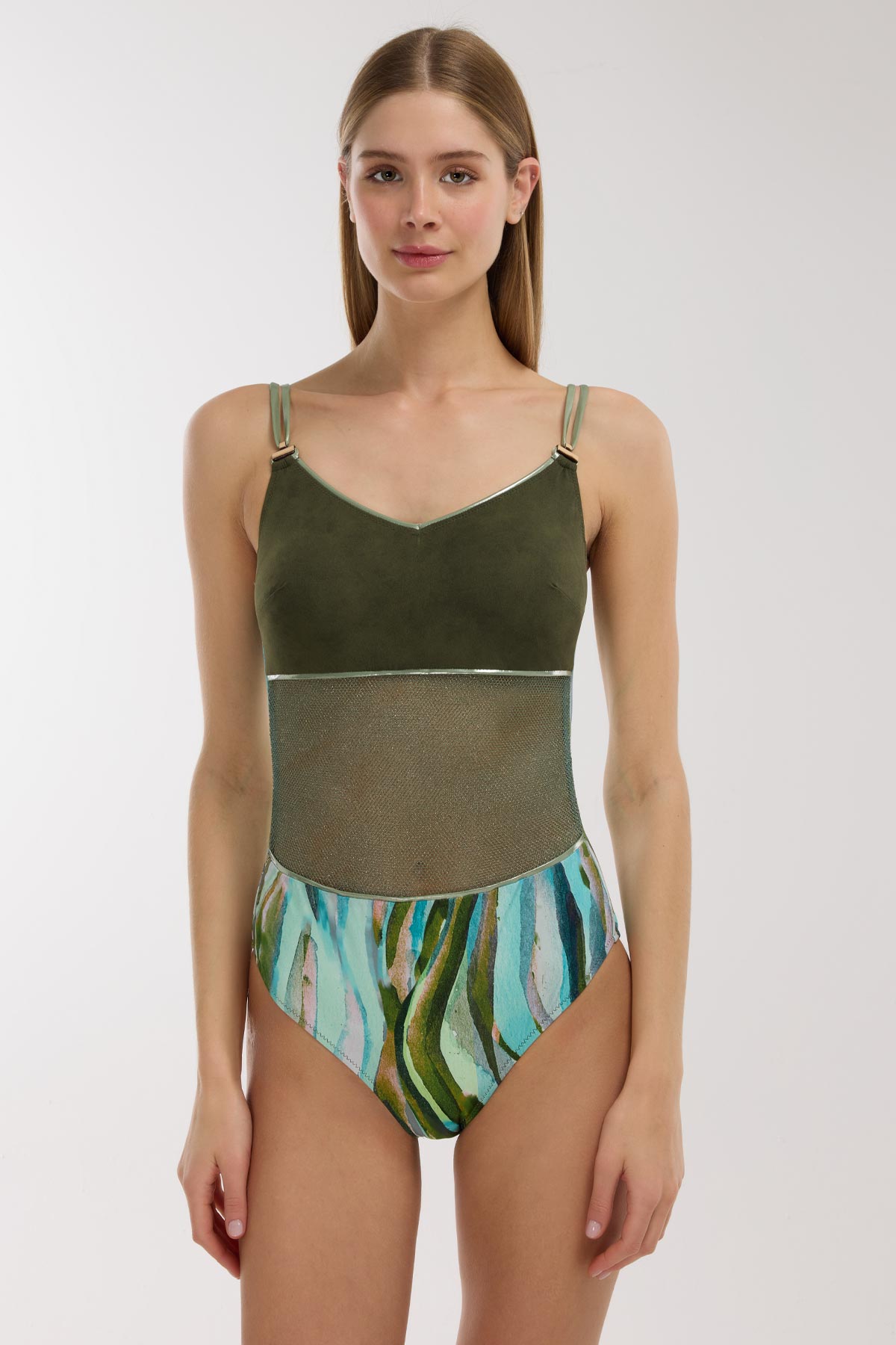 Plaj modasında ezber bozan bir tasarım; üst kısımda zengin süet görünümlü kumaşın asil duruşu, gövdede ise şifonun zarif transparanlığıyla buluşuyor. Haki tonlarının hakim olduğu bu mayo, bel hattındaki metalik şerit geçişi ve alt kısımdaki sanatsal fırça darbesi desenleriyle sofistike bir silüet yaratıyor. Çift ince askı detayı ve göğüs formunu vurgulayan kesimiyle modern bir şıklık sunan bu model, doku farklılıklarıyla stilini bir üst seviyeye taşımak isteyenler için tasarlandı.