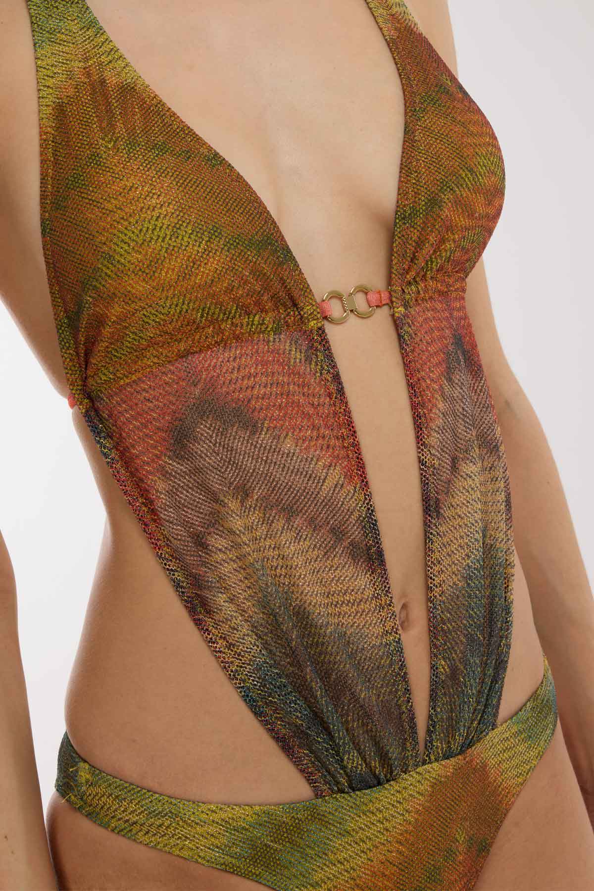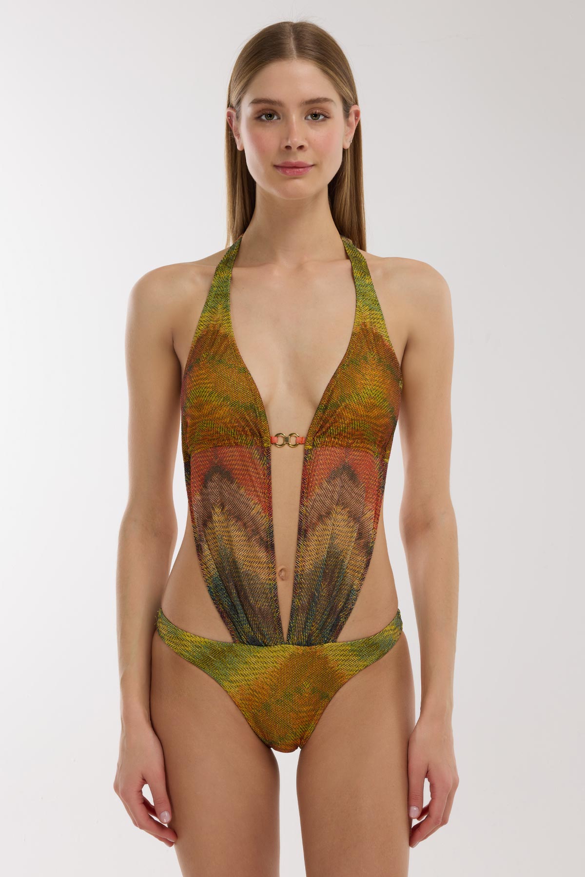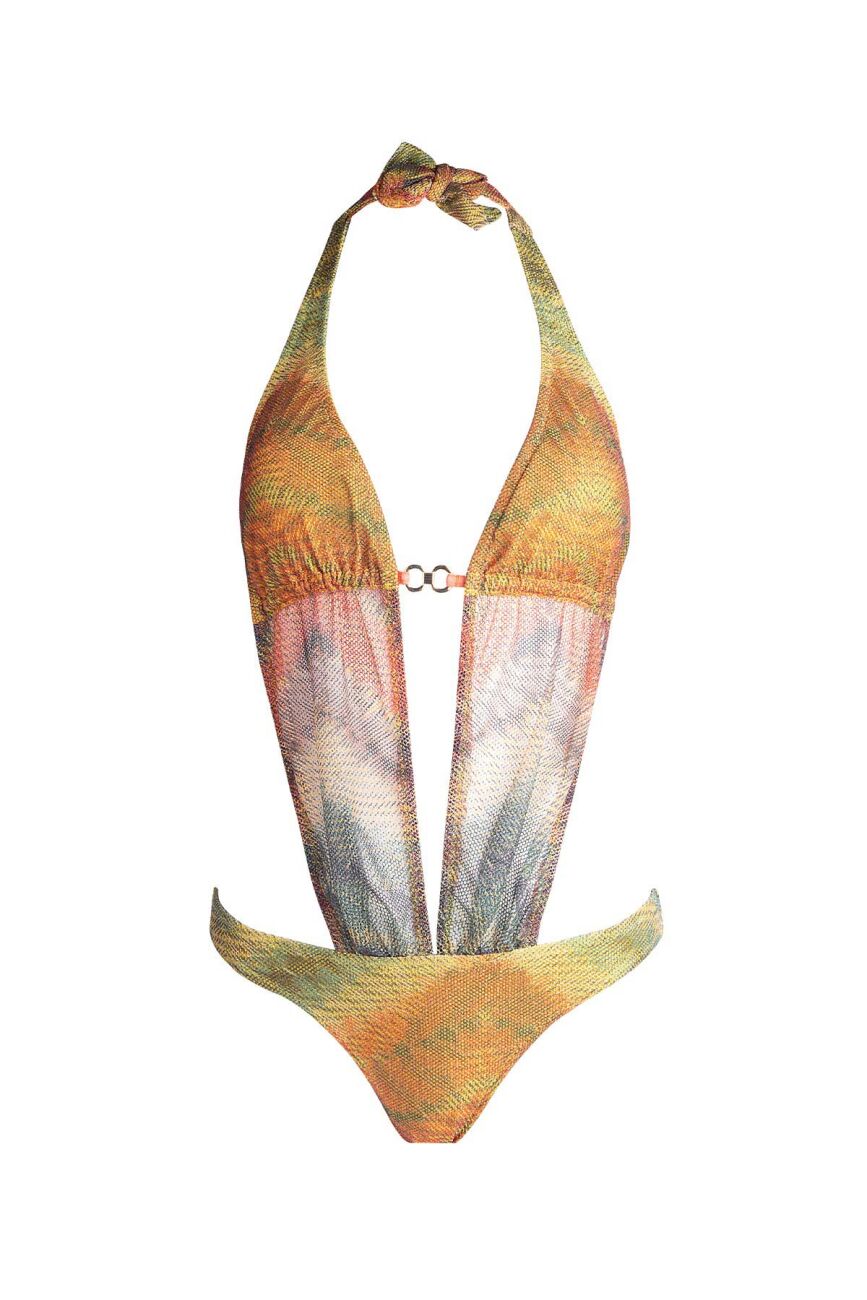 Vizon tonlarının asil ve doğal şıklığını cesur bir tasarımla buluşturan bu mayokini, plaj stilinde sofistike bir duruş sergiliyor. Göğüs kısmının dokulu yapısı, göğüs altından mayo altına kadar uzanan transparan şifon tül panel ile birleşerek büyüleyici bir kontrast ve mistik bir hava oluşturuyor. Göğüs ortasında yer alan altın renkli halka aksesuar ve bu detayı tamamlayan pencere dekoltesi, tasarıma lüks bir imza atıyor. Boyundan bağlamalı ince askısı ve bel hattını zarifçe vurgulayan kesimiyle hem iddialı hem de estetik bir silüet arayanlar için tasarlandı.