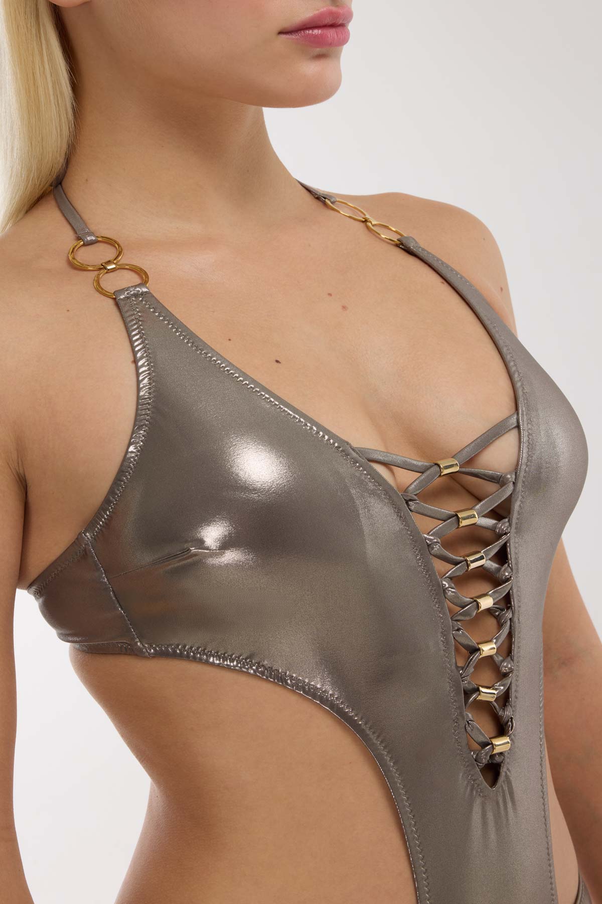 Haki rengin soğuk ve modern asaletini ayna efektli lame kumaşla birleştiren bu mayokini, plajda tüm bakışları üzerinde toplamak isteyenler için tasarlandı. Göğüs dekoltesindeki çapraz bağlama detayı ve bu bağlamaları zenginleştiren altın rengi metal aksesuarlar, tasarıma sofistike ve lüks bir dokunuş katıyor. Bel bölgesindeki geniş pencere dekoltesi (cut-out) vücut hatlarını zarifçe vurgularken, omuzlardaki halka detaylı askılar modern silüeti tamamlıyor. Hem cesur hem de ultra-lüks bir duruş sergileyen bu parça, yazın enerjisini en parlak haliyle yansıtıyor.