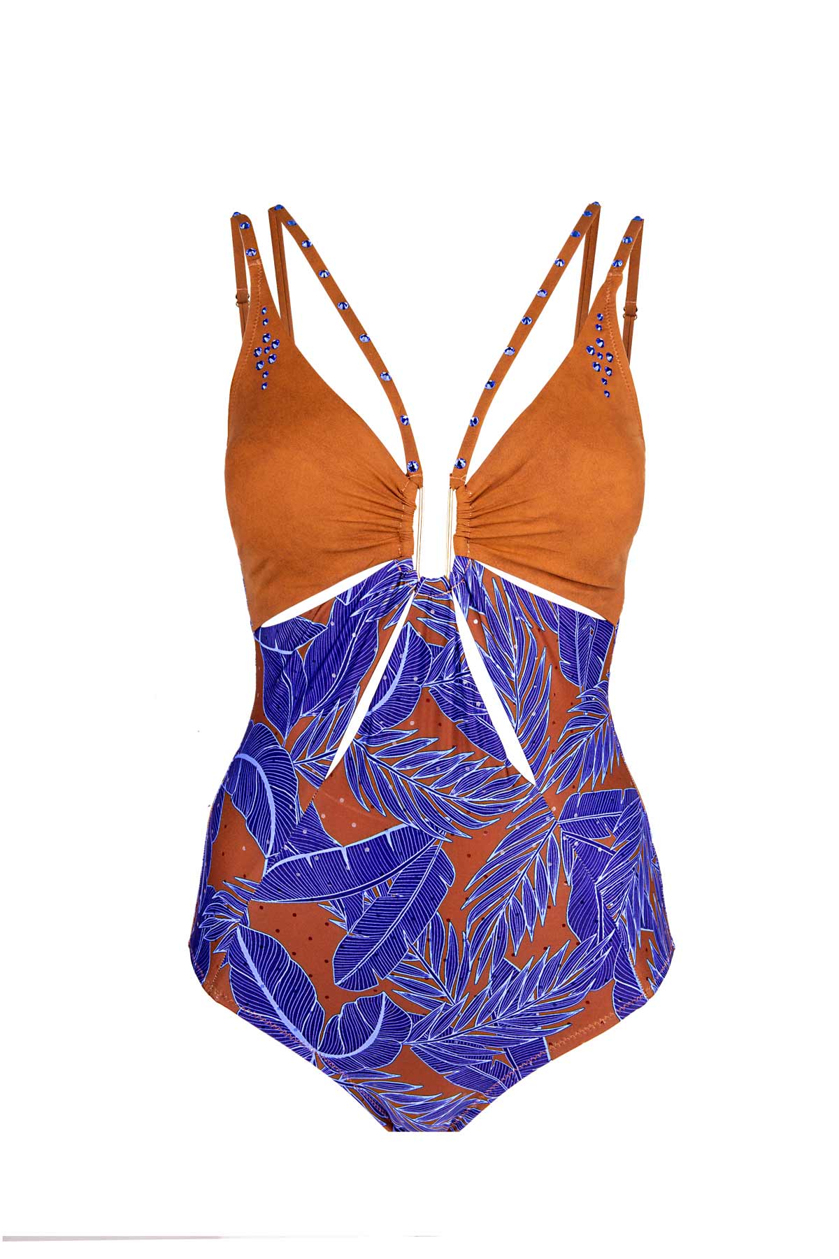 Taba renginin sıcak dokusunu mor palmiye desenlerinin egzotik enerjisiyle buluşturan bu mayo, plaj modasına cesur ve sanatsal bir dokunuş katıyor. Göğüs ortasında yer alan dikey altın aksesuar ve stratejik pencereli (cut-out) dekolte detayları, vücut hattına modern bir derinlik ve estetik kazandırıyor. Omuzlardan arkaya doğru uzanan çoklu ince askı tasarımı, her açıdan iddialı bir silüet oluştururken; renklerin canlı uyumu güneşin tüm enerjisini stilinize taşıyor. Hem grafik bir duruş hem de göz kamaştırıcı bir şıklık arayanlar için ideal bir seçim.