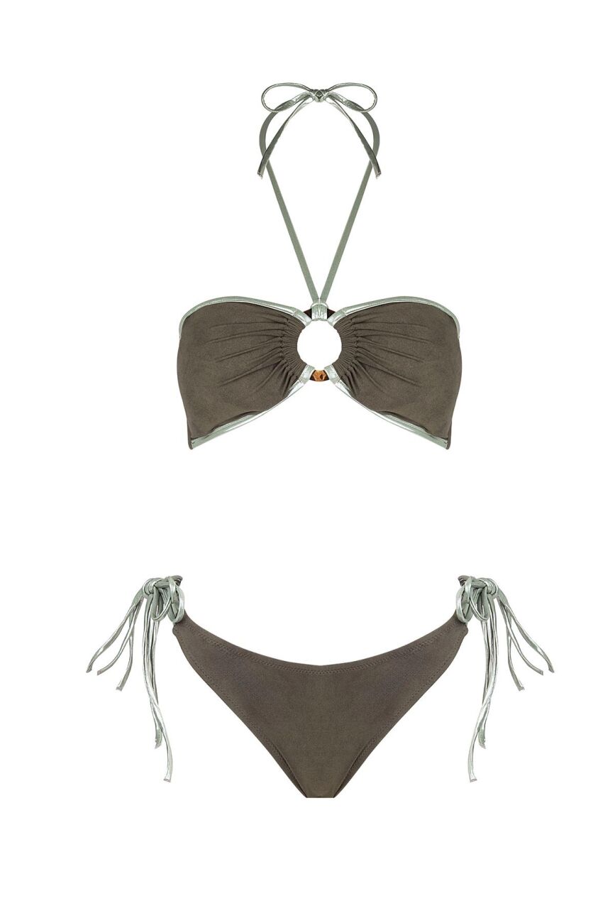 Göğüs ortasında konumlanan karakteristik halka aksesuar, büzgü detaylarıyla birleşerek heykelsi bir form oluştururken; boyundan bağlamalı bandeau kesim omuz hattınızı zarifçe vurgular. Alt parçadaki çoklu yan bağlama ipleri ise hem kişiselleştirilebilir bir konfor sunar hem de hareket halindeyken ışıltılı bir silüet yaratır. Hem teknik kumaşın sunduğu güvenli form hem de lame detayların yarattığı premium hisle, bu yaz sahilin en ikonik figürü siz olacaksınız.