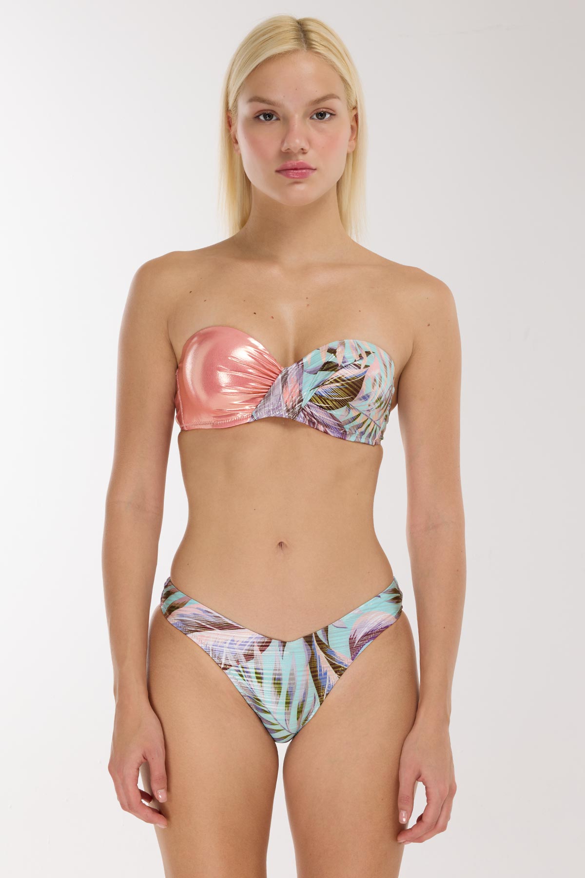 Tasarımın en dikkat çekici parçası olan üst bölüm, büzgülü twist (burgu) detayı sayesinde ister boyundan bağlamalı ister straplez olarak kullanılabilir; bu da size stilinizde eşsiz bir özgürlük sunar. Bikini altı ise dünya moda literatüründe "V-Front" veya "V-Cut" olarak bilinen, ön orta kısmı aşağı doğru kavislenen özel kesimiyle dikkat çekiyor. Karın bölgesini daha uzun ve ince gösteren bu ikonik kesim, desenli kumaşın enerjisiyle birleşerek heykelsi bir duruş sergiliyor. Hem dokuların bu canlı oyunu hem de lame kumaşın premium hissiyle, bu yazın en göz alıcı stil figürü siz olacaksınız.