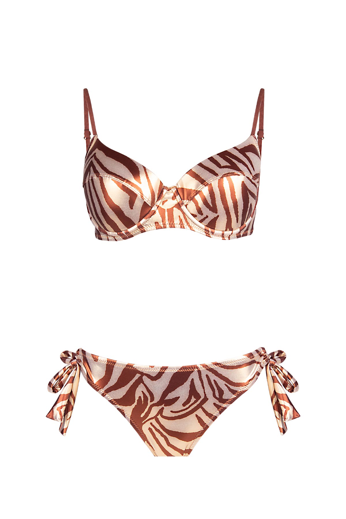 Sahil şeridinde tüm bakışları üzerinizde toplayacak, cesur ve lüks bir silüetle tanışın. Bu özel tasarım, zamansız zebra desenini bakır tonlarındaki parlak lame kumaşın büyüleyici yansımalarıyla birleştiriyor. Güneş ışığını her hareketinizde ustalıkla yakalayan parlak dokusu, sahil şeridinde iddialı ve lüks bir duruş sergilemenizi sağlar.