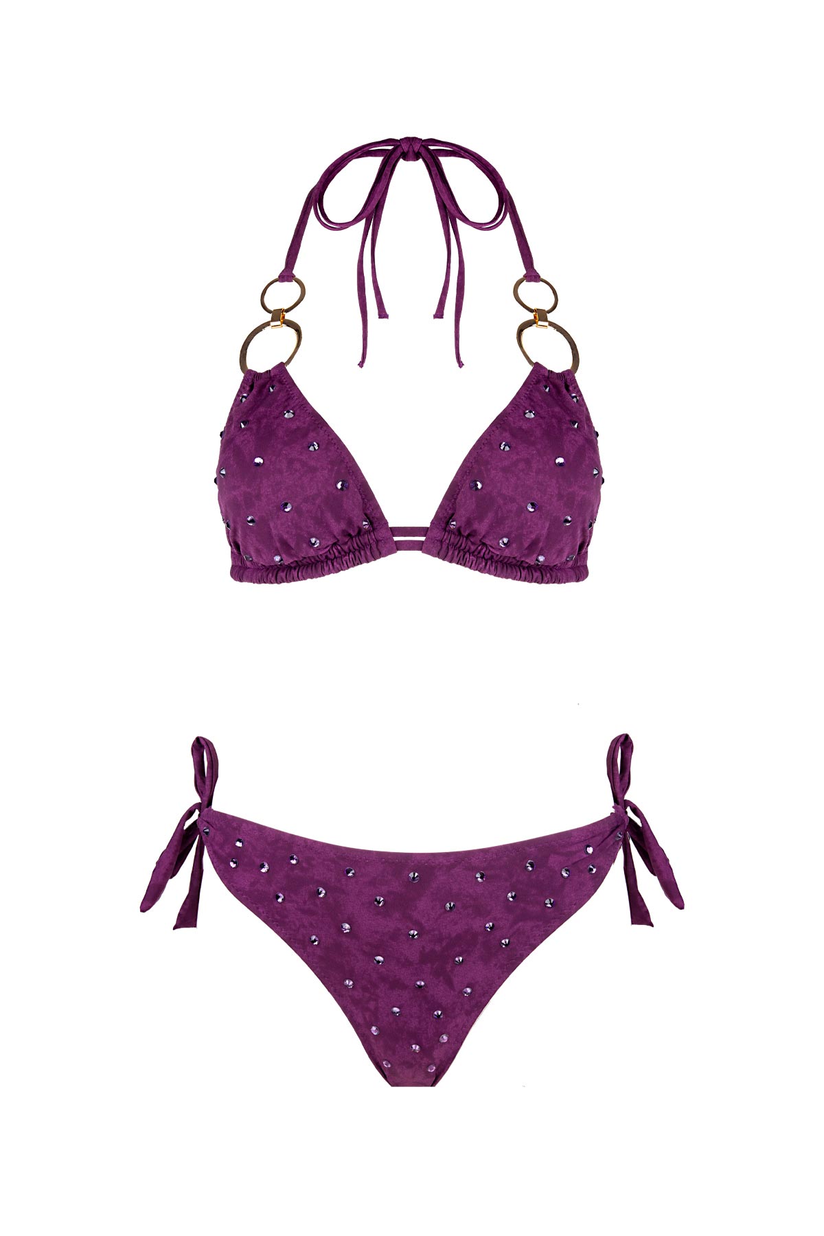 Plaj modasında ihtişamı ve zarafeti bir araya getiren bu tasarım, derin mor tonunun büyüleyici etkisini lüks detaylarla taçlandırıyor. Markamızın karakteristik süet deri görünümlü mayo kumaşı, bu modelde morun en zengin tonuyla hayat bulurken; üzerindeki ton-sur-ton taş işlemeleri her adımda güneşin ışıltısını üzerinizde taşımanızı sağlıyor.