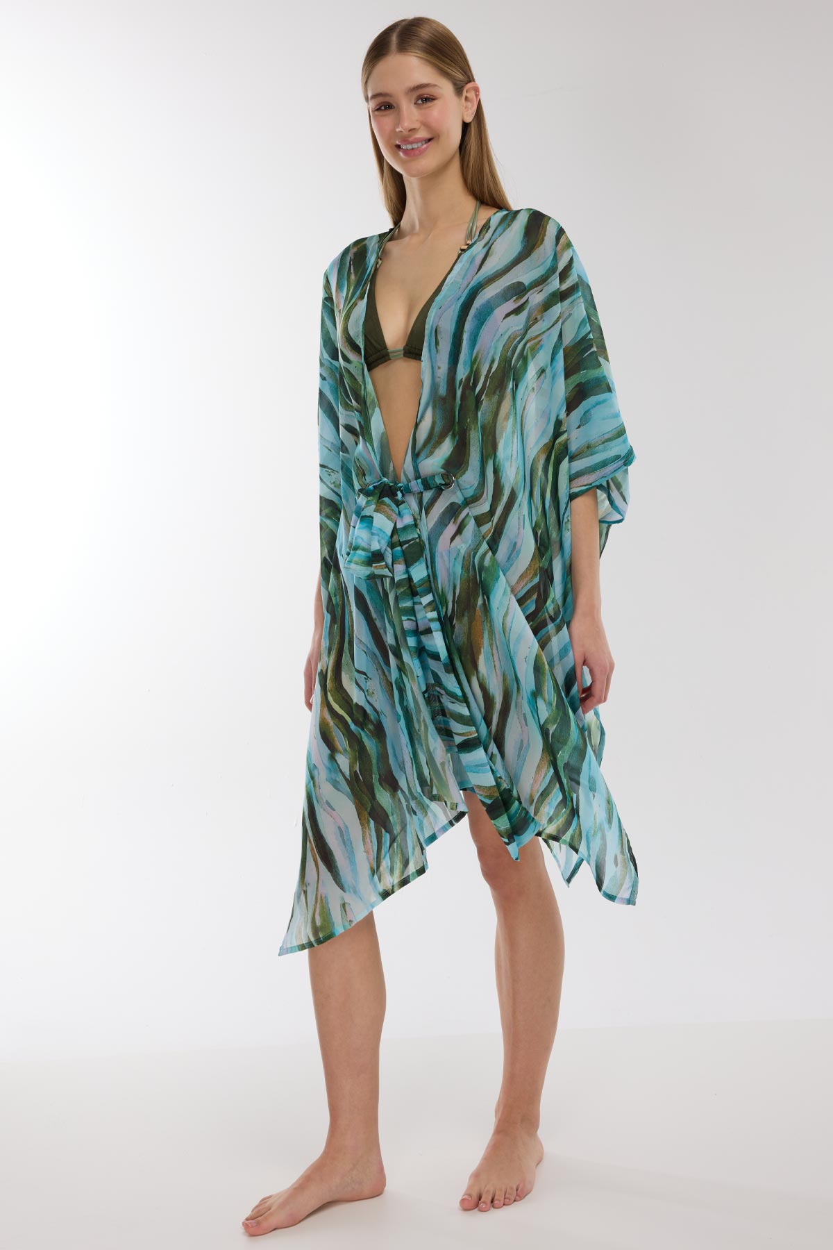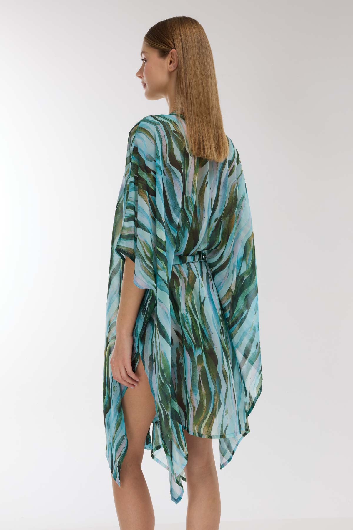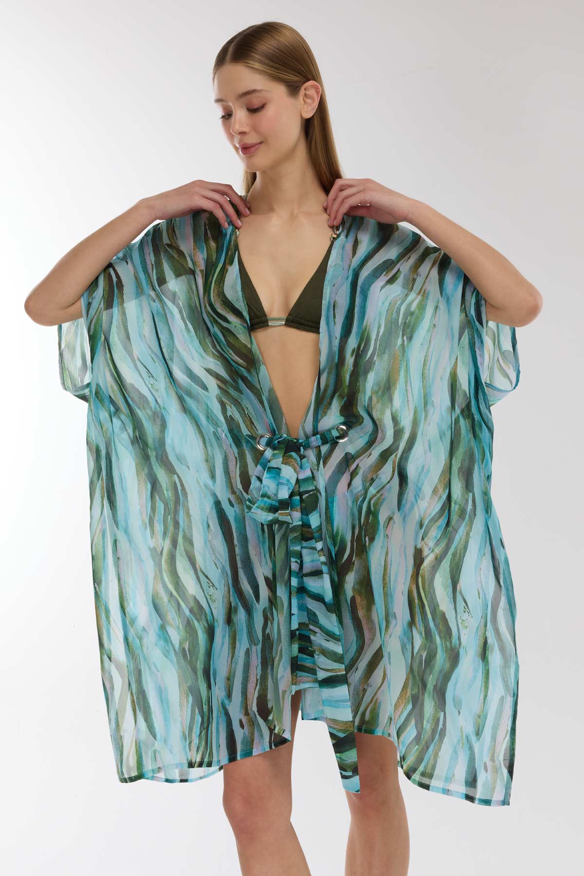 Yeşil ve mavi tonlarının iç içe geçtiği suluboya efektli soyut ve akışkan deseniyle bu plaj elbisesi, yaz stilinize sanatsal ve modern bir dokunuş katıyor. Uçuş uçuş şifon kumaşın hafifliği, sıcak yaz günlerinde ferah ve şık bir kullanım sunar. Bel bölgesinde yer alan iki adet kuş gözü (eyeleters) ve bu halkalardan geçen fiyonk bağlama detayı, bel hattınızı zarifçe vurgularken tasarıma lüks bir imza atıyor. Derin V yaka kesimi ve dökümlü kolları ile zahmetsiz bir zarafet sergileyen bu elbise, plajdan akşamüstü gezintilerine kadar her anınıza eşlik edecek. Bu desenin büyüleyici mayo ve bikini modelleriyle plaj kombinini mutlaka tamamlayın.