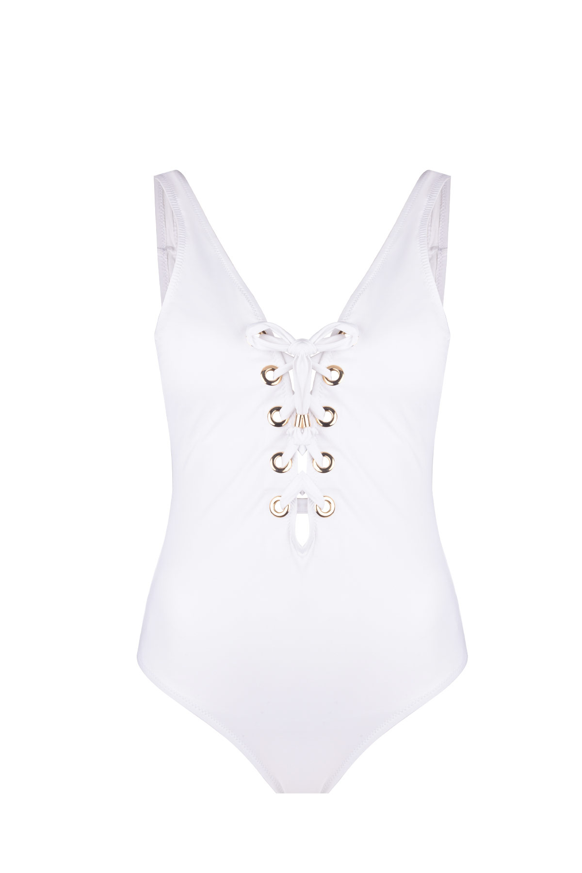 Beyazın asaletini lüks metalik detaylarla buluşturan bu mayo, plaj stilinize hem modern hem de sofistike bir dokunuş katıyor. Derin V yaka kesimiyle feminen bir silüet sunan tasarımın ön kısmında, gold renkli kuş gözü (eyelet) detayları ve arasından geçen zarif bağlama yer alıyor. Korsaj etkili bu çapraz bağlama ve fiyonk detayı, bel hattınızı vurgularken tasarıma lüks bir imza atıyor. Geniş omuz askıları gün boyu konforlu bir kullanım sunar. Hem zarif bir duruş sergilemek hem de gold aksesuarların ışıltısıyla fark yaratmak isteyenler için her detay titizlikle düşünüldü.
