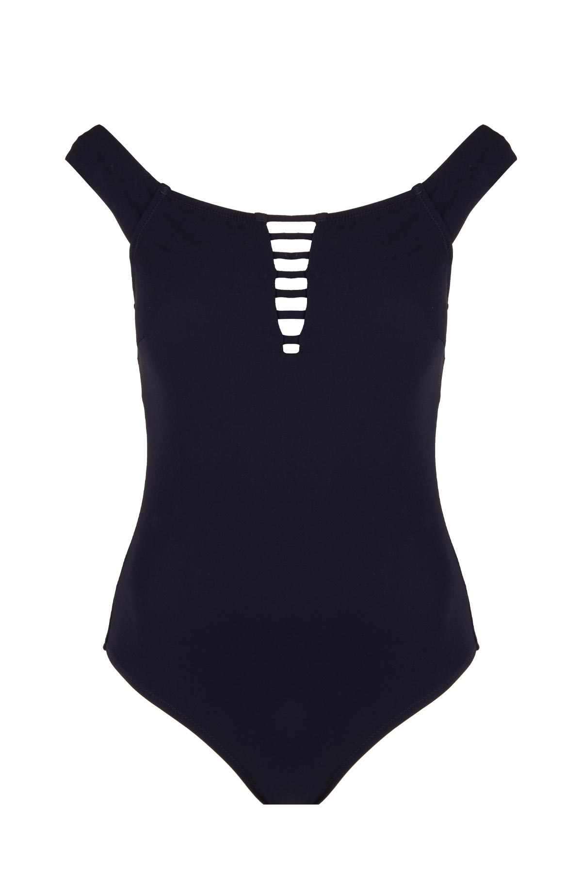 Yaz gardırobunuza modern ve sofistike bir dokunuş katmak için tasarlanan bu siyah off-shoulder mayo, klasik şıklığı geometrik detaylarla buluşturuyor. Pürüzsüz, mat siyah kumaşıyla mükemmel bir uyum sağlayan bu tek parça mayo, vücut hatlarınızı zarifçe şekillendirirken modern bir silüet oluşturuyor. Mayonun odak noktası olan off-shoulder kesimi, omuzlarınızı zarifçe sergilerken, omuzların üzerinde duran kalın bantlar hem destek sağlıyor hem de şık bir duruş sunuyor. Göğüs ortasındaki dikey dekolte, içindeki paralel yatay şerit barlarıyla iddialı ve modern bir hava katarak tasarıma benzersiz bir kimlik kazandırıyor. Klasik bacak oyuntusu, hem konforlu bir hareket özgürlüğü hem de dengeli bir görünüm sunuyor Bu çok yönlü parça, sadece plajda veya havuz başında değil, aynı zamanda yüksek belli şortlar, etekler veya pantolonlarla eşleştirilerek şık bir bodysuit olarak da kullanılabilir. Gündüzden geceye zahmetsiz bir geçiş için mükemmel bir seçenek.