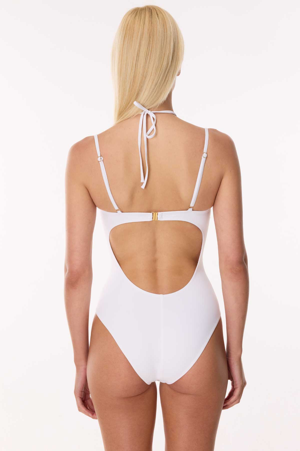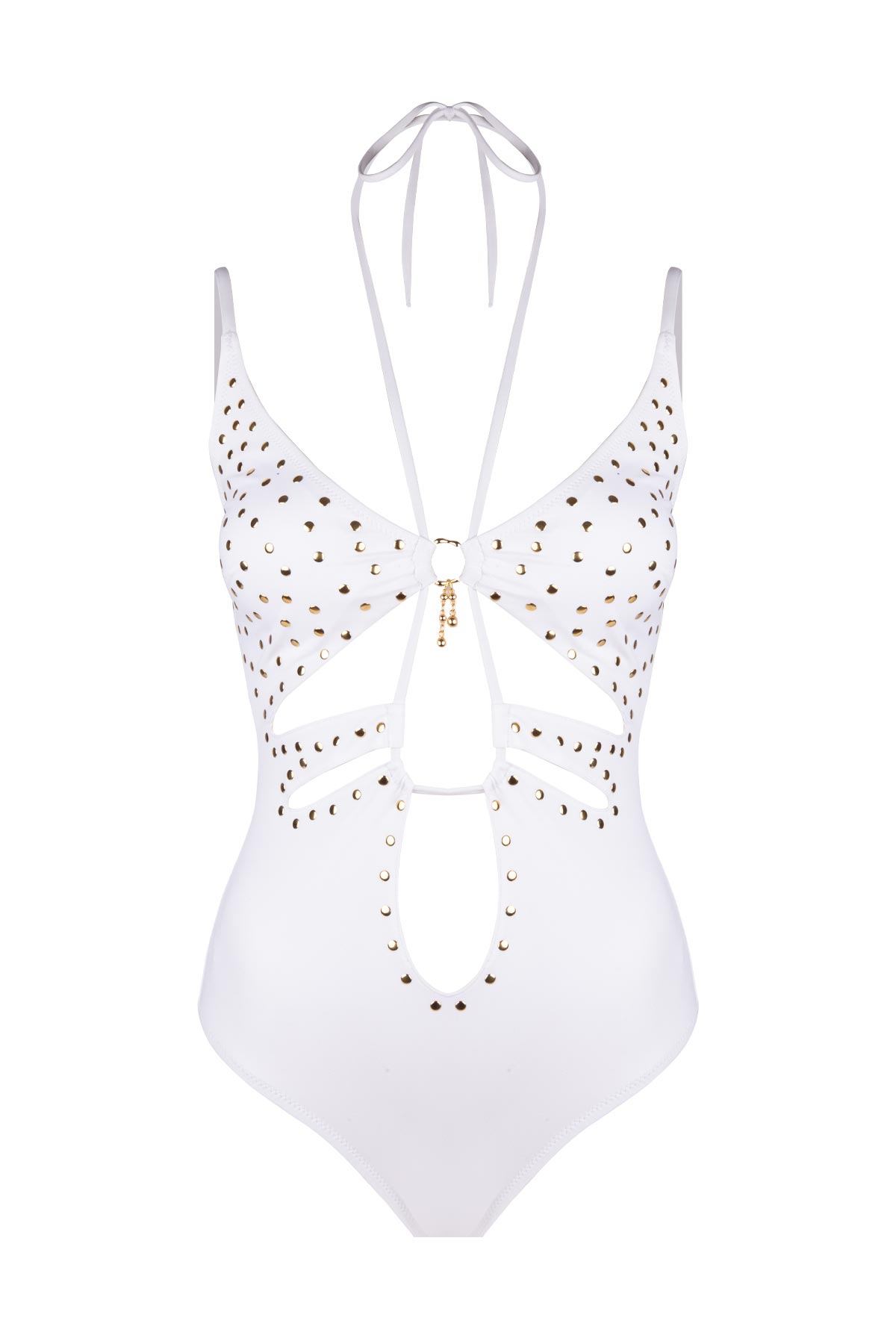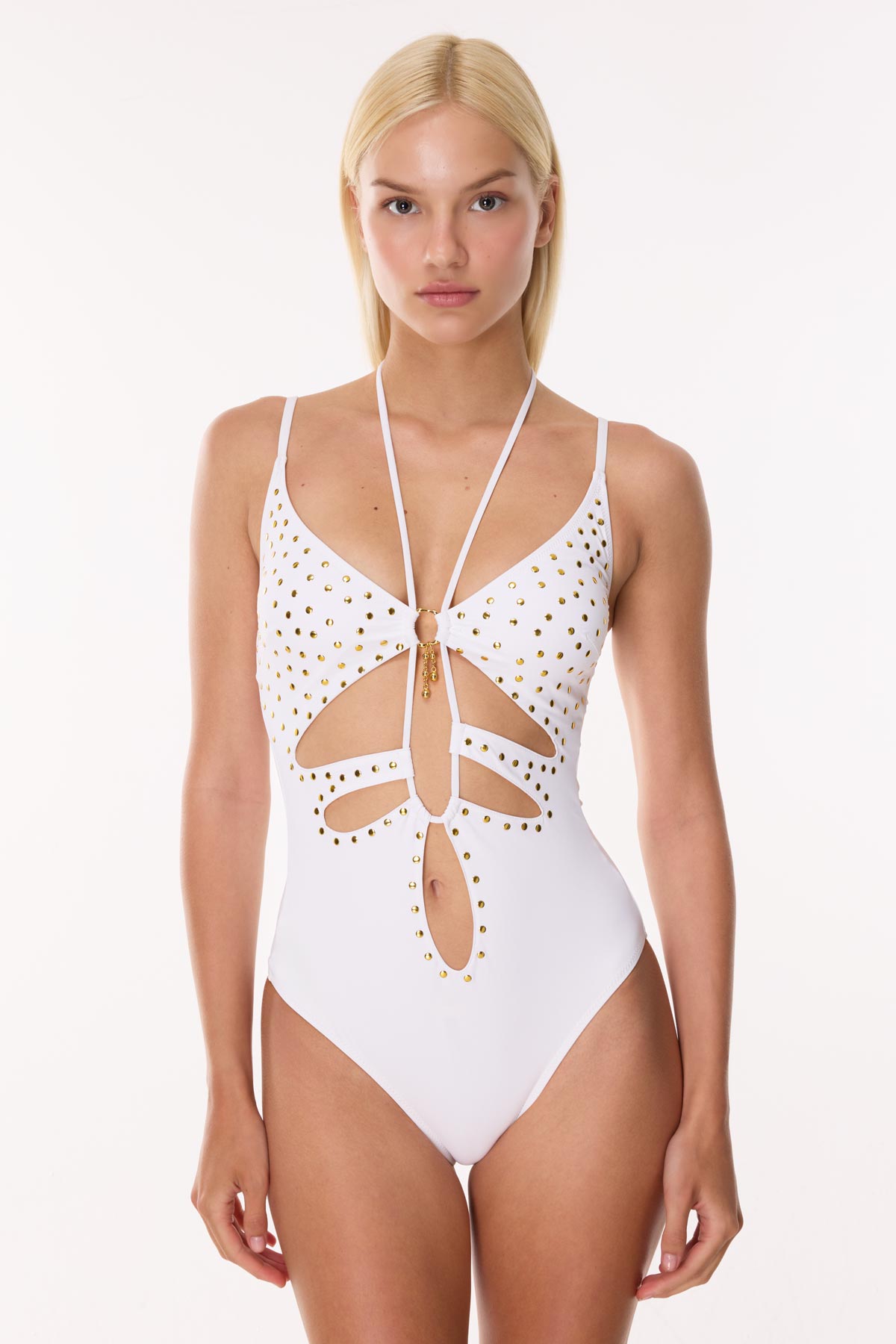 Beyazın saf enerjisini altın renginin lüks dokunuşlarıyla buluşturan bu özel tasarım mayo, plaj stilinde fark yaratmak isteyen kadınlar için tasarlandı. Gövde üzerinde ustalıkla kurgulanan pencereli (cut-out) kesimler, vücut hatlarını zarif bir estetikle vurgularken modern ve cesur bir silüet ortaya koyuyor. Tasarımın karakteristik ruhunu belirleyen el işçiliği gold zımba işlemeler, ışığı yansıtan yapısıyla hem retro bir hava hem de fütüristik bir şıklık sunarak tasarıma derinlik katıyor.