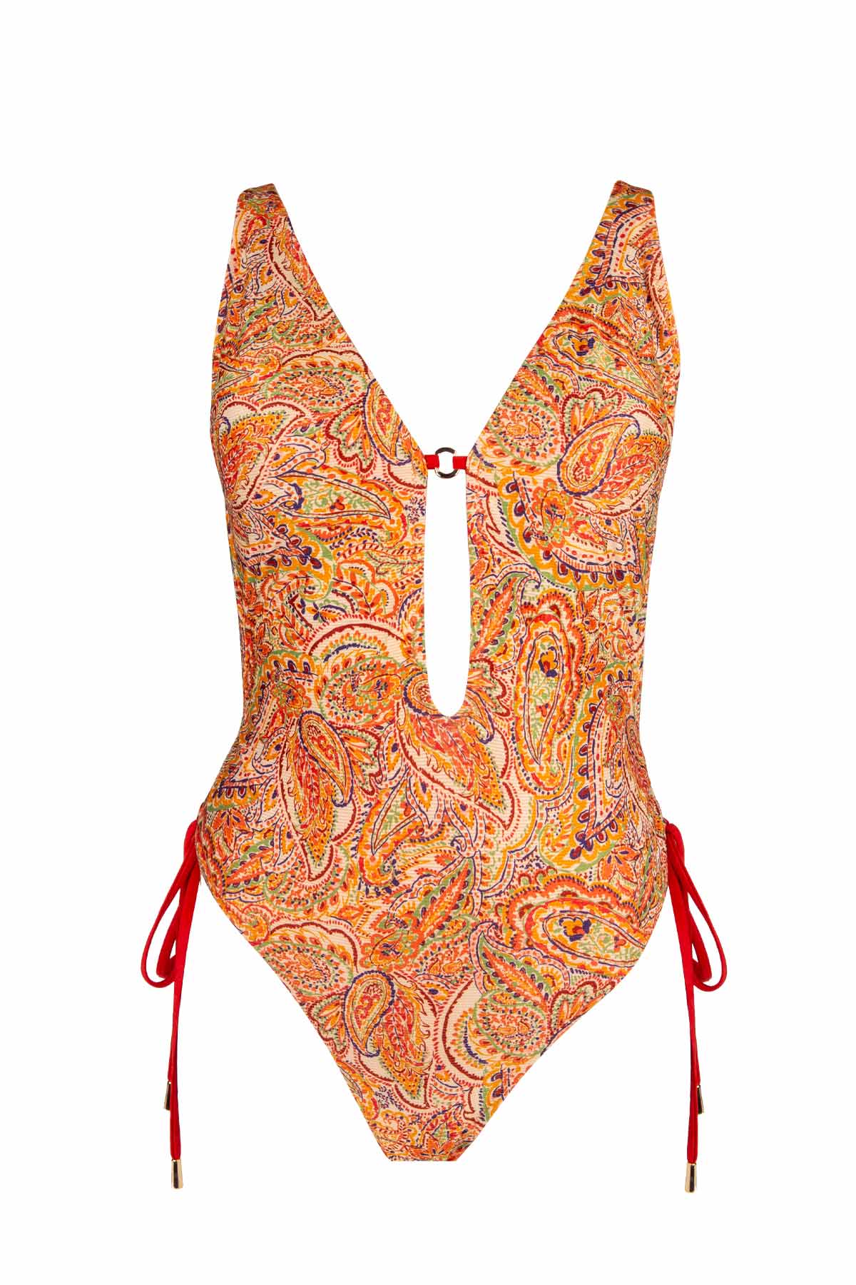 Doğanın huzurlu renk paletini yansıtan zengin turuncu ve krem tonlarındaki bohem şal (paisley) deseniyle bu mayokini, plaj stilinize otantik ve modern bir dokunuş katıyor. Sıradanlıktan uzaklaşan tasarım, göğüs ortasından mideye kadar uzanan geniş ve geometrik bir oyuk (cut-out) detayı ile vücut hatlarınıza iddialı bir geometri oluşturur. Göğüs ortasında zarif bir biye ve küçük bir aksesuar yer alarak dekolte bölgesine şık bir odak noktası kazandırır. Mayokininin yan kısımlarındaki büzgüler vücut hattınızı zarifçe dengelerken, fiyonk bağlamalar hem fonksiyonel kullanım sunar hem de feminen bir hava katar. Fiyonk uçlarındaki gold metal aksesuarlar ise, güneşin her anını ışıltıyla yakalayan sofistike bir dokunuş sunuyor. Hem bohem bir duruş hem de göz alıcı bir şıklık arayanlar için her detay titizlikle düşünüldü.
