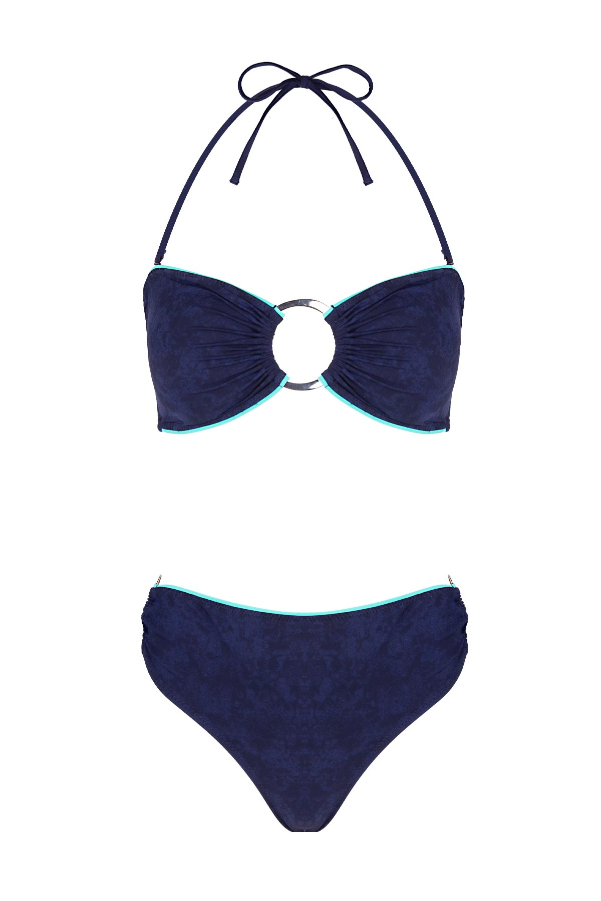 Plaj stilinde hem fonksiyonelliği hem de iddialı detayları bir arada arayanlar için tasarlanan bu bikini takımı, lacivertin derinliğini turkuazın enerjisiyle buluşturuyor. Tasarımın en dikkat çekici özelliği, göğüs ortasında ve bikini altının yanlarında kullanılan gümüş rengi halka aksesuarlardır. Bu metalik dokunuşlar, takıma modern ve sofistike bir hava katarken, bikini kenarlarından geçen turkuaz rengindeki ince biyeler tasarıma dinamik bir çerçeve kazandırıyor.
