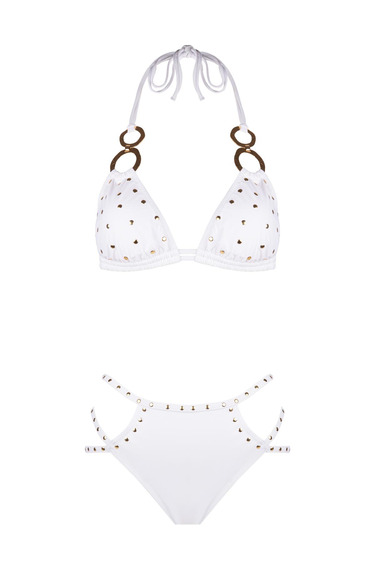 Beyazın saf enerjisini lüks metalik detaylarla buluşturan bu bikini takımı, plaj stilinize hem modern hem de göz alıcı bir dokunuş katıyor. Zamansız üçgen kesimli üst parça, omuz askılarındaki gold renkli halka aksesuarlar ve kumaş üzerine işlenmiş gold zımba (stud) detayları ile bronz teninizde mükemmel bir kontrast sunar. Boyundan ve sırttan bağlamalı askıları sayesinde vücudunuza göre mükemmel uyum sağlar. Kombini tamamlayan bikini altı ise, kalça üzerindeki üçlü ince askı geçişleri ve gold zımba işlemeleriyle iddialı bir dekolte oyunu sergiler. Hem asil bir silüet yansıtmak hem de plaj modasında fark yaratmak isteyenler için her detay titizlikle düşünüldü.