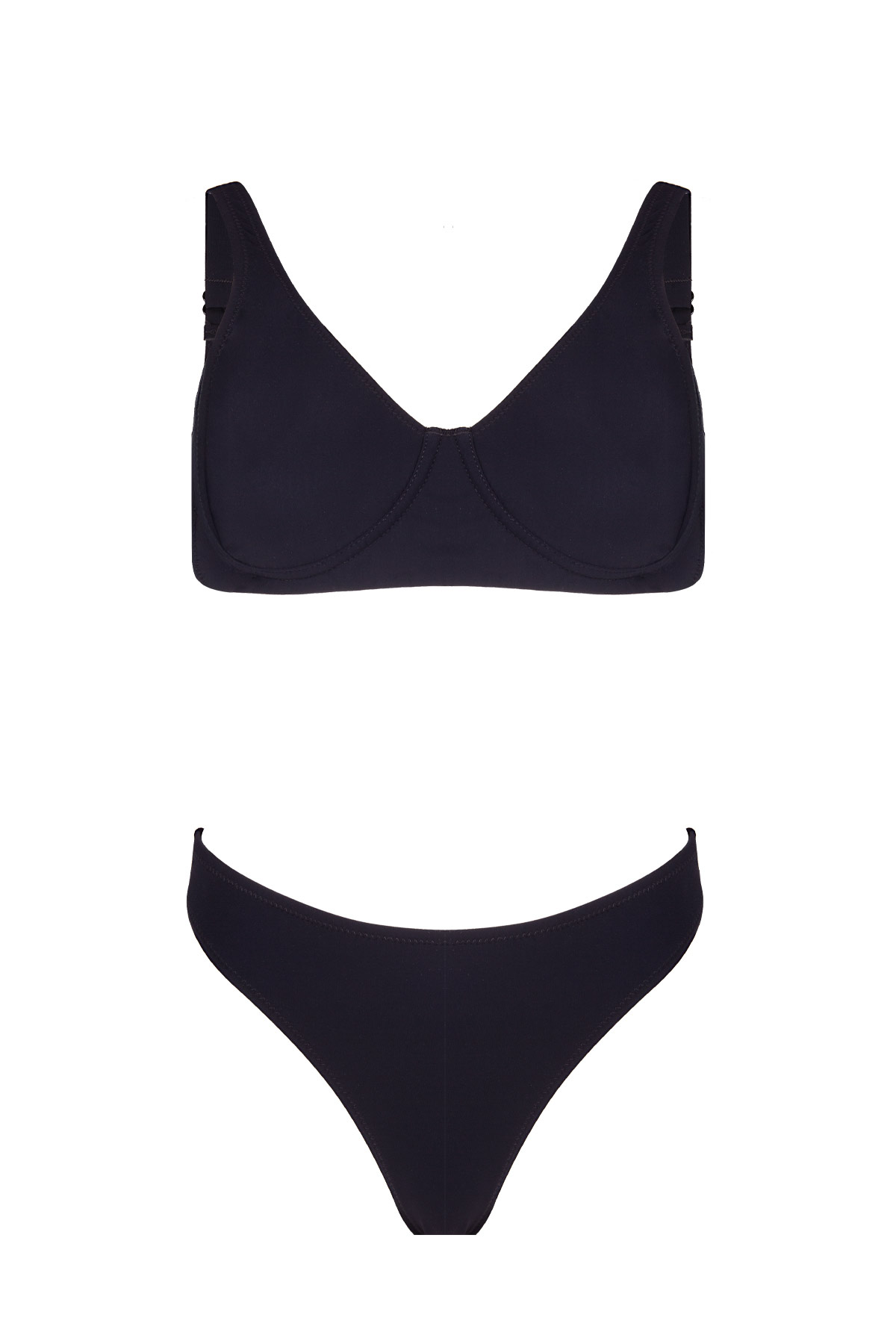 Minimalist tasarımı ve toparlayıcı özelliğiyle ön plana çıkan bu siyah bikini takımı, plajda konforlu bir şıklık arayanlar için tasarlandı. Kapsız olmasına rağmen özel biye balenli yapısı sayesinde göğüs formunu doğal bir şekilde destekleyen üst parça, omuzlardaki geniş askı detaylarıyla ekstra konfor sunar. Bacak boyunu daha uzun gösteren modern bir kesime sahiptir. Vücut hatlarını kusursuzca saran esnek kumaşıyla hem havuzda hem denizde kendinizi güvende ve şık hissetmenizi sağlar.