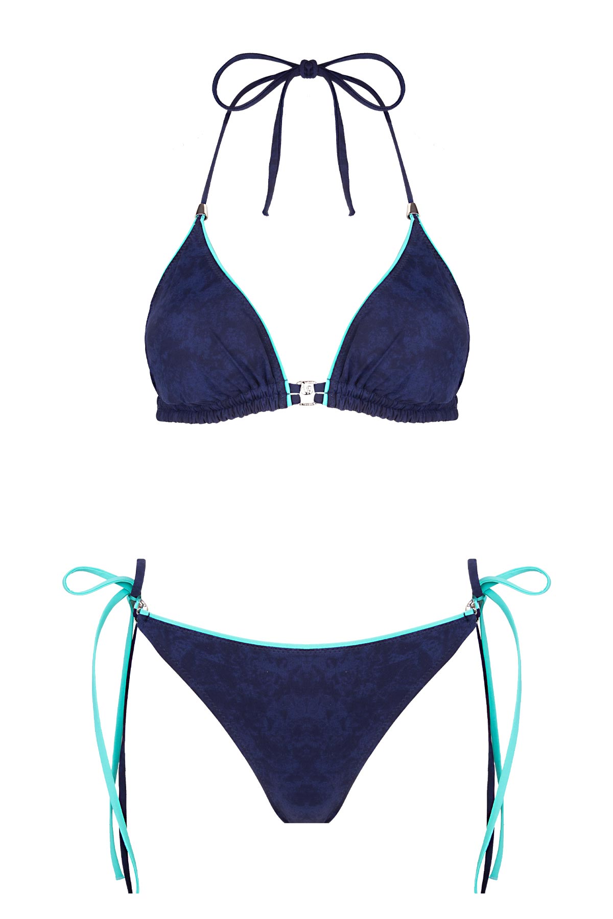 Tasarımın odak noktasında yer alan göğüs ortasındaki ve bikini altının yanlarındaki gümüş renkli metalik aksesuarlar, ürüne mücevher zerafetinde bir ışıltı katıyor. Boyundan bağlamalı üçgen kesim üst parça ve yanları çift kordonlu bağlama detayına sahip alt parça, hem kişiselleştirilebilir bir konfor sunuyor hem de gümüş detayların parıltısını her adımda ön plana çıkarıyor. Hem teknik kumaşın sunduğu kusursuz form hem de kontrast renklerin yarattığı premium hisle, bu yazın en stil sahibi ismi siz olacaksınız.