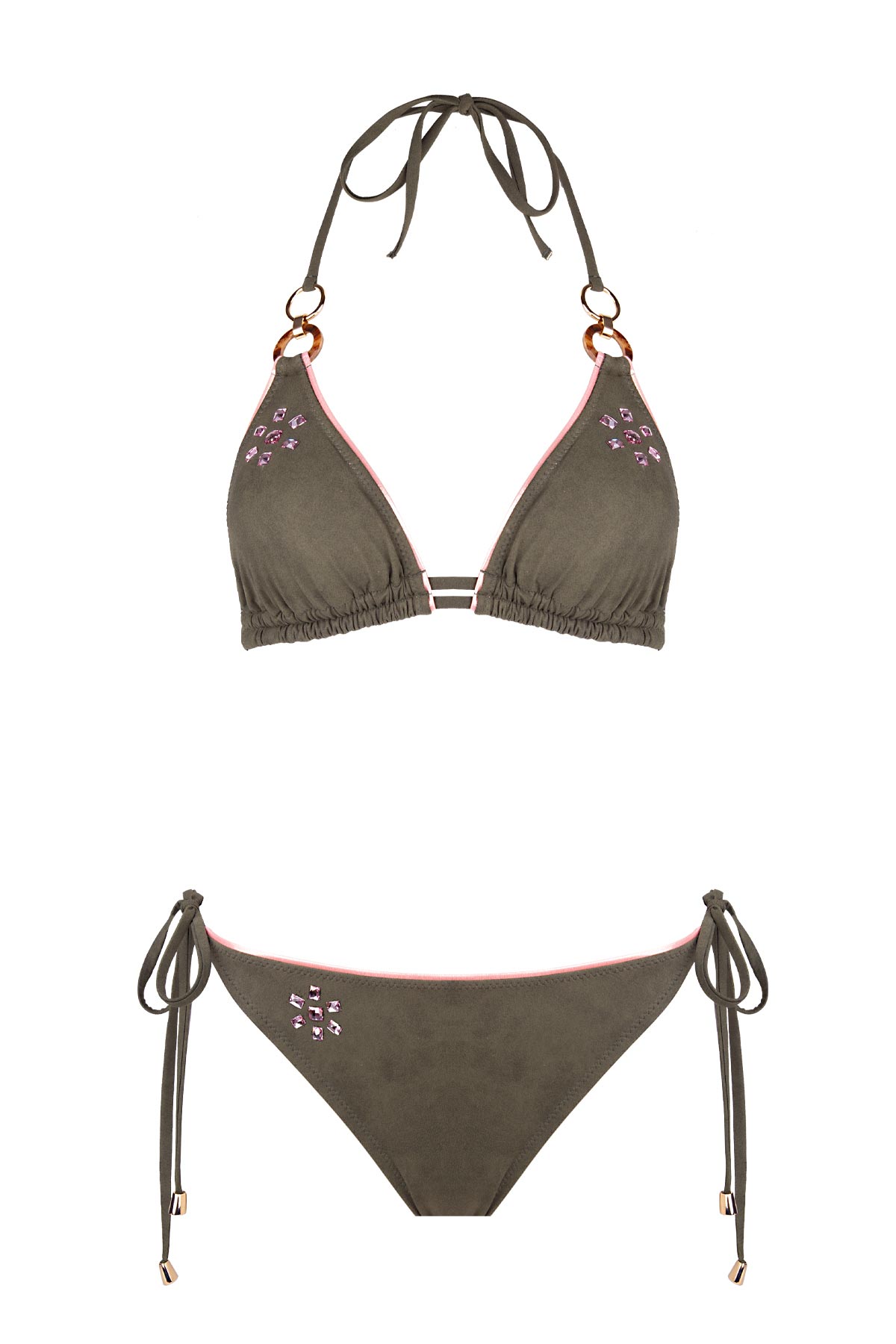 Haki yeşilinin doğal ve ağırbaşlı duruşunu süet görünümlü mayo kumaşının lüks dokusuyla birleştiren bu tasarım, detaylardaki zerafetiyle ön plana çıkıyor. Bikini takımı etrafını saran somon rengi parlak lame biyeler, süet kumaşın mat dokusuyla mükemmel bir kontrast yaratarak silüetinize enerjik bir çerçeve kazandırıyor. Hem üst hem de alt parçada titizlikle yerleştirilen taş işlemeleri, güneşin her açısında büyüleyici bir parıltı sunarak plaj şıklığınızı mücevher zerafetinde bir üst seviyeye taşıyor.