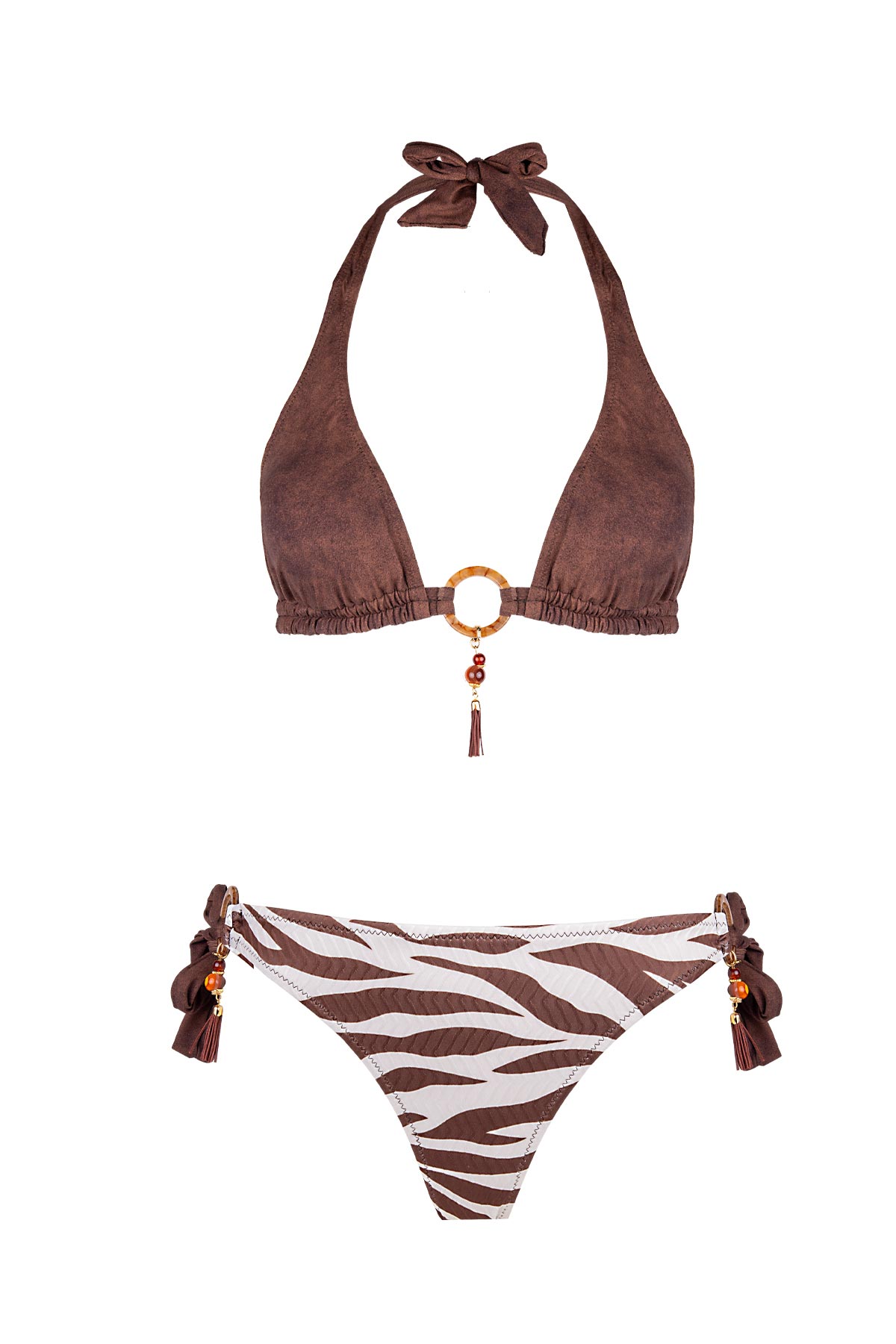 Doğanın özgür ruhunu yansıtan zengin kahve ve krem tonlarındaki zebra deseniyle bu bikini, plaj modasına cesur ve lüks bir dokunuş katıyor. Süet görünümlü kumaşın asil dokusu, göğüs ortasındaki kemik halka aksesuar tasarıma sofistike bir parıltı kazandırır. Boyundan bağlamalı üçgen üst parça, vücudunuza göre ayarlanabilir konfor sunar. Kombini tamamlayan alt parça ise, yanlardaki halka aksesuarları ve ayarlanabilir bağlama detaylarıyla hem fonksiyonel hem de estetik bir silüet oluşturur. Yumuşak dokusu ve desenin ritmiyle bu yazın en iddialı parçalarından biri olmaya aday.
