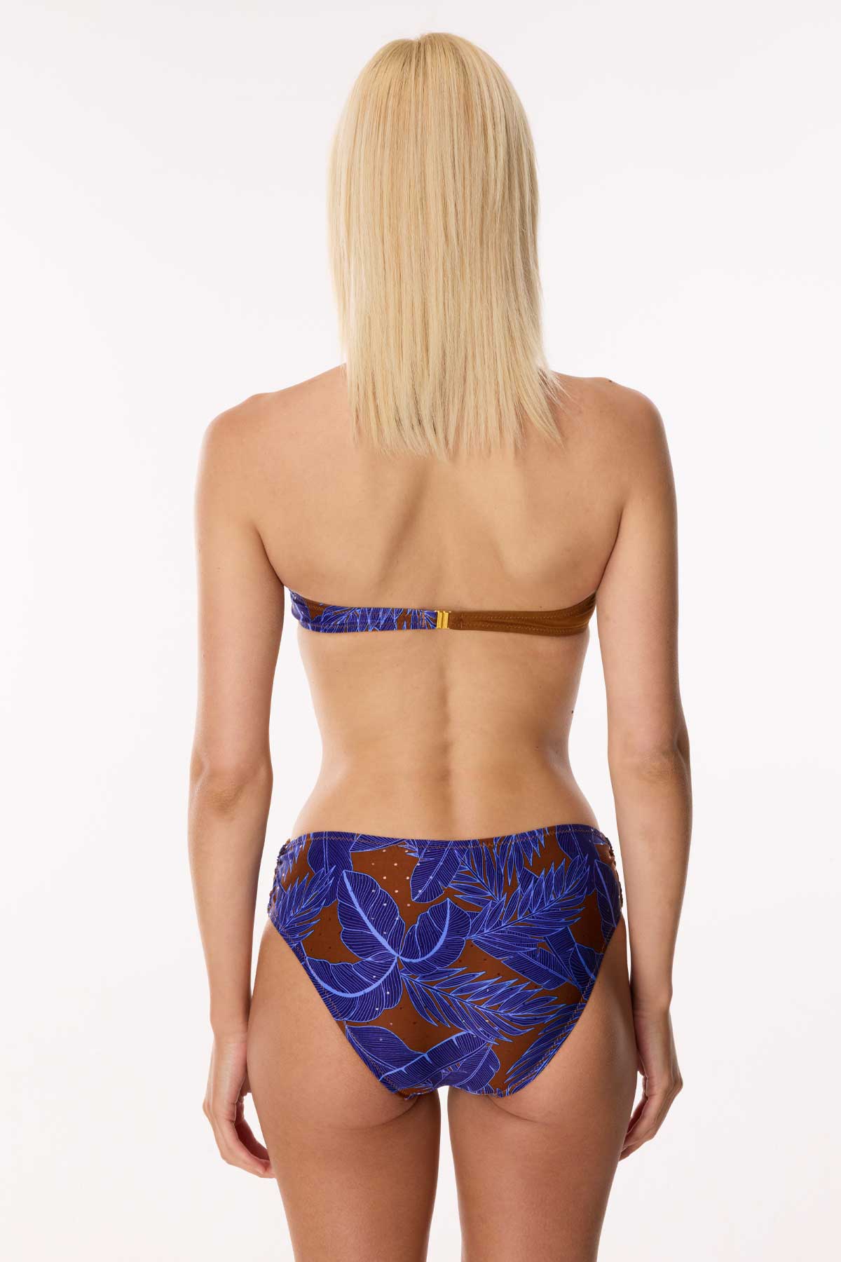 Mor palmiye desenlerinin sıcak taba tonlarıyla yarattığı egzotik kontrastı, lüks detaylarla buluşturan bu bikini takımı, plaj stilinizde hem konfor hem de çarpıcı bir duruş sunuyor. Göğüs formunu kusursuzca destekleyen üst parça, çıkarılabilir askıları sayesinde straplez olarak da kullanılabilir ve bronzlaşma özgürlüğü sağlar. Askılarındaki mor parlak taş işlemeleri tasarıma sofistike bir ışıltı katarken, yüksek bel alt parçası karın bölgesini toparlayarak fit bir silüet oluşturur. Alt parçanın her iki yanında yer alan gold renkli metal halka detayları, bu modern ve fonksiyonel takıma lüks bir imza atıyor. Hem güneşlenirken hem de havuz başında kendinizi güvenli ve ultra-şık hissetmeniz için tasarlandı.