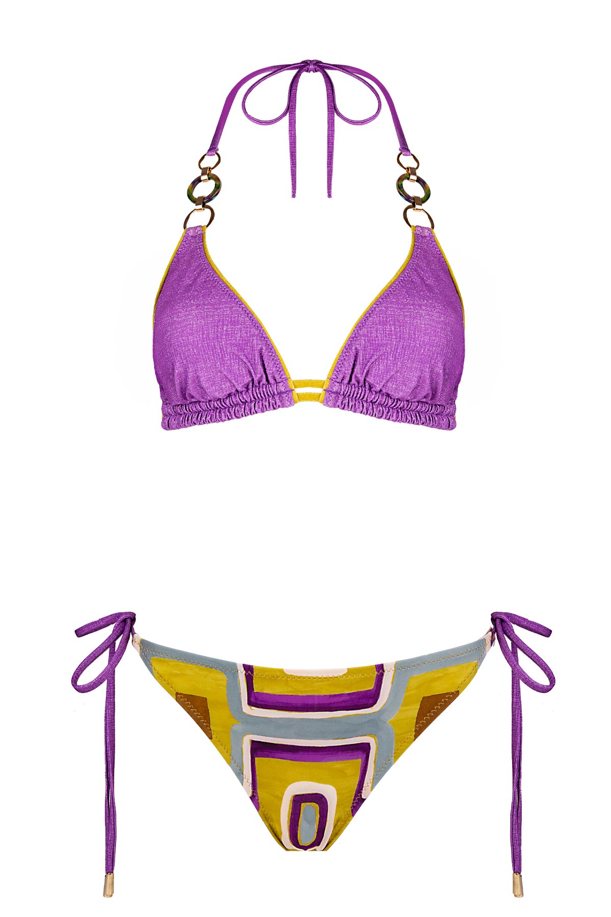 Plaj modasında ezber bozan bir şıklık arayanlar için tasarlanan bu takım, iki farklı dokuyu cesurca birleştiriyor. Mor simli kumaştan üretilen ışıltılı bikini üstü, güneşin altında göz alıcı bir parlaklık sunarken, askılarındaki kemik ve gold metal halka aksesuarlarla sofistike bir dokunuş kazanıyor. Kombini tamamlayan alt parça ise, mor, hardal ve bebek mavisi tonlarının hakim olduğu retro geometrik desenleri ve yanlardaki ayarlanabilir fiyonk bağlamalı. Hem nostaljik hem de modern bir duruş sergileyen bu ışıltılı kombin, bu yazın favorisi olmaya aday.