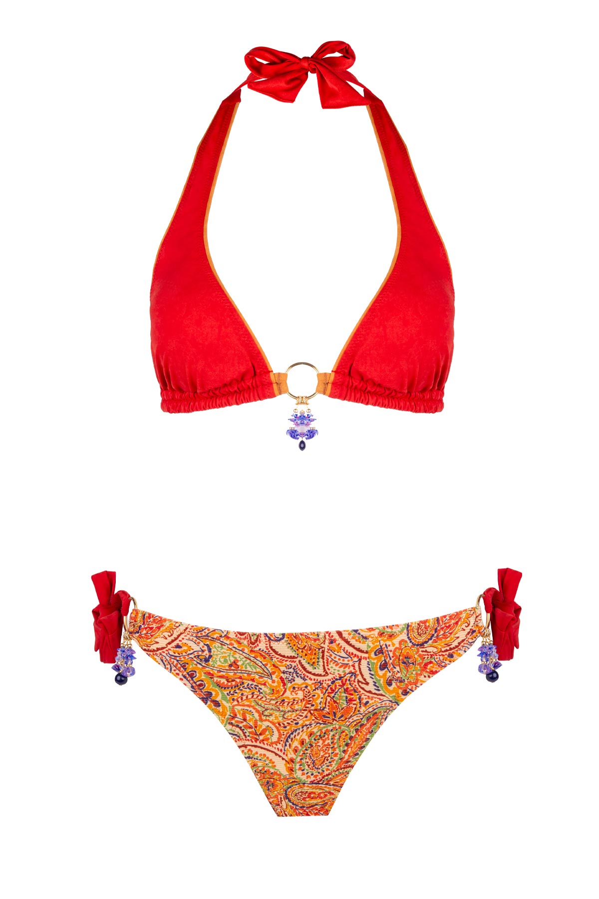 Canlı kırmızı rengin enerjisini otantik şal (paisley) deseniyle buluşturan bu bikini takımı, plaj stilinize lüks bir imza atıyor. Boyundan bağlamalı üçgen üst parça, göğüs ortasındaki gold metal halka ve ucundaki mor kristal taşlı aksesuar ile dekolte bölgesine sofistike bir ışıltı kazandırır. Kombini tamamlayan bikini altı ise, yan kısımlarındaki gold renkli metal halka detayları ve bu halkalardan sarkan mor taşlı sallantılı aksesuarları ile hareketli ve göz alıcı bir silüet oluşturur. Yanlardaki fiyonk bağlamalar hem fonksiyonel kullanım sunar hem de tasarıma feminen bir hava katar. Her detay, güneşin altında parıldamanız için titizlikle düşünüldü.
